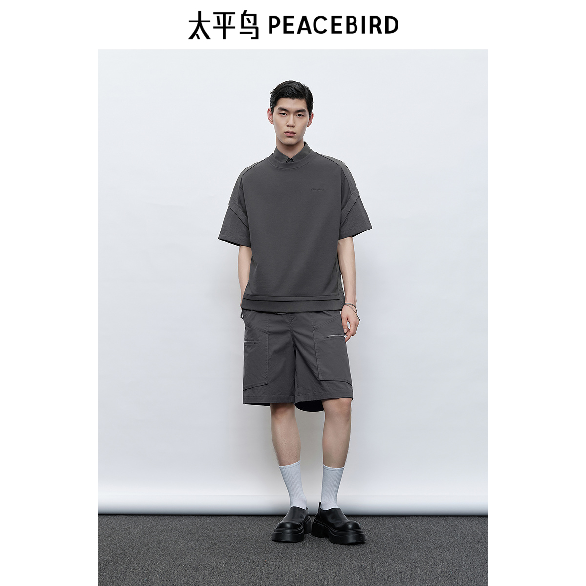 青年半袖 太平鸟男装 T恤潮流潮牌拼接体恤衫 刺绣短袖 户外工装