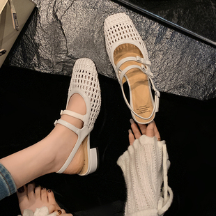 粗跟配裙子罗马凉鞋 绝美透气镂空羊皮编织包头单鞋 女 法式 2025新款