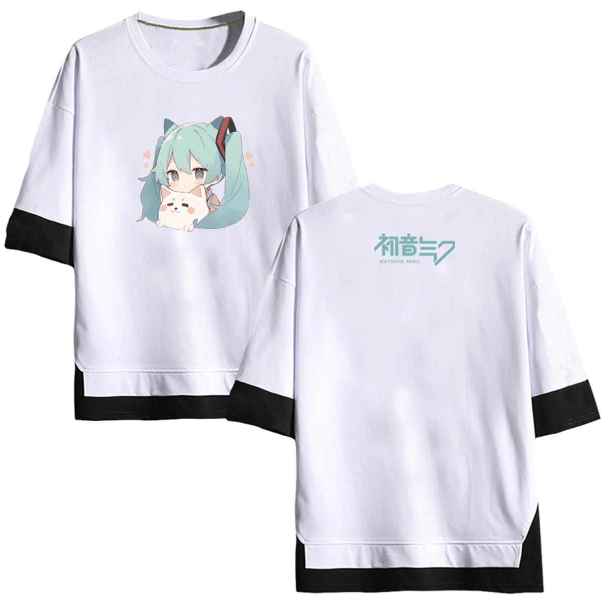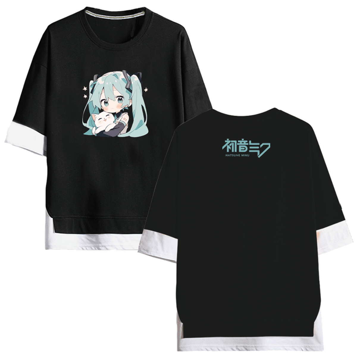 初音miku动漫周边卡通印花二次元 T恤假两件 日系可定制男情侣短袖