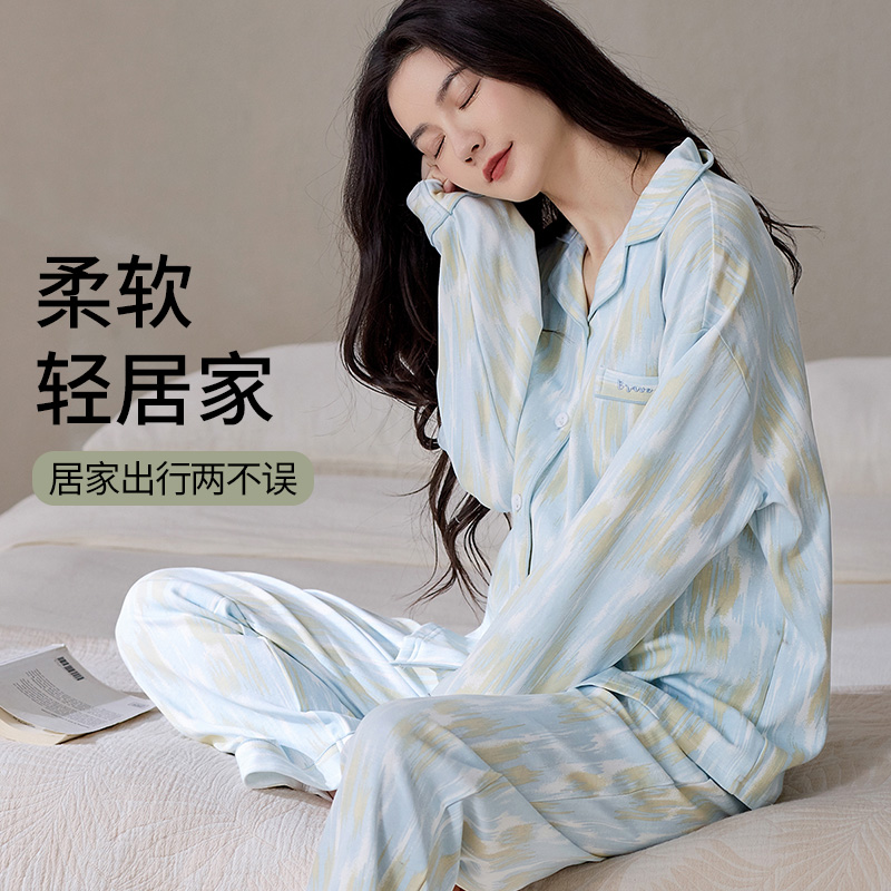 家居服套装 长裤 长袖 熊猫花花润微纯棉睡衣女士春秋简约全棉大码
