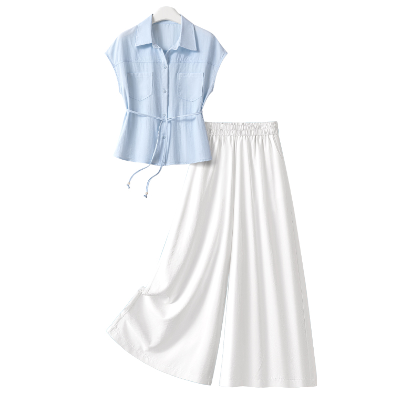 薄2025新款 女夏季 短袖 衬衫 两件套 优雅气质穿搭时尚 九分阔腿裤 套装