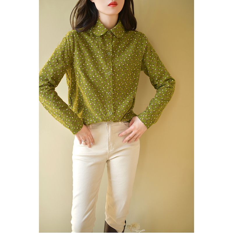 高级感花卉刺绣职场风OL纯棉衬衣长袖 新款 上衣 女2025秋季 蓝色衬衫