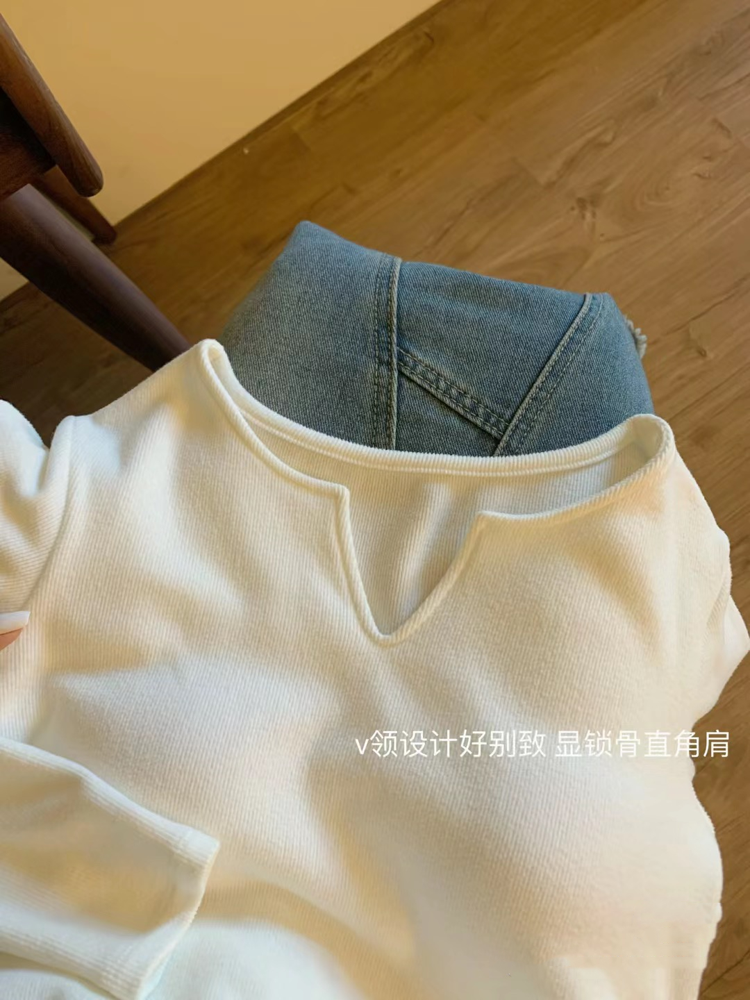 辣妹修身 打底衫 显瘦上衣 T恤女春秋内搭短款 设计感小众正肩V领长袖