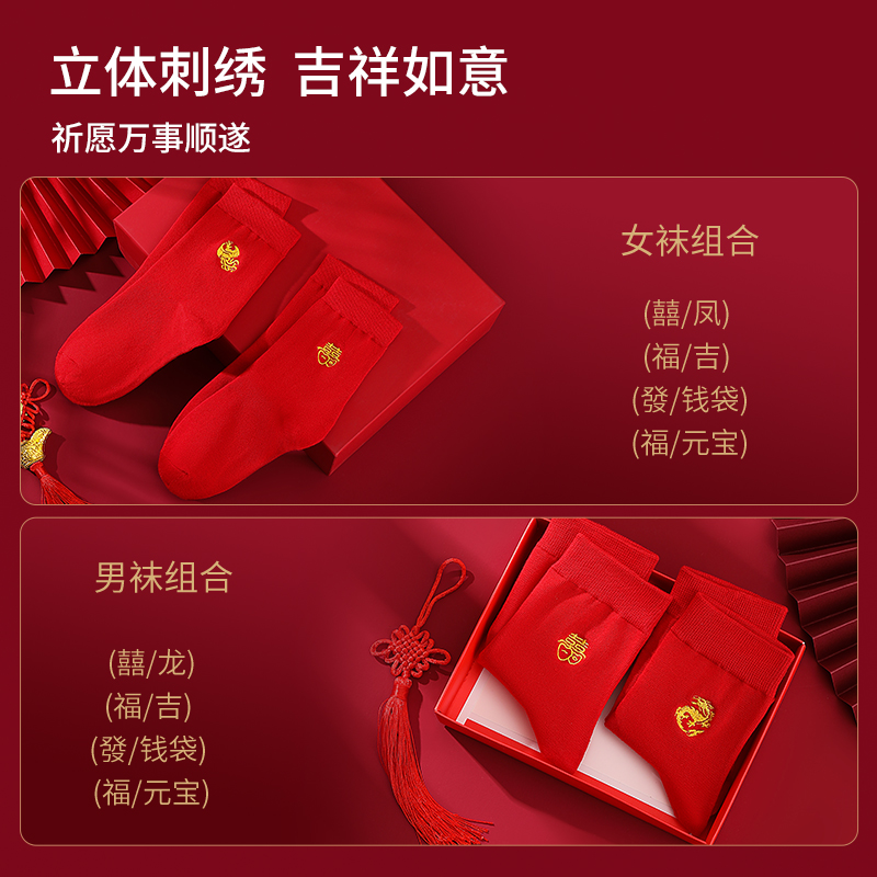 雅黛俪本命年红色袜子男女士情侣刺绣新年结婚喜庆中筒棉袜春秋季