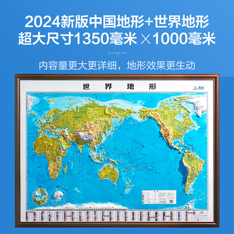 立体地图 世界地形 100cm 1350超大精雕版 地势地形学生教室办公室 135 2024新版 世界地图挂图墙贴 3d地形图立体凹凸地图