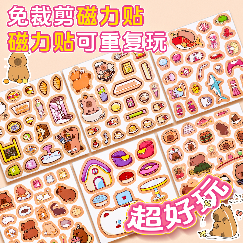 书磁力贴河豚水豚门永存磁性慈溪贴吸铁石手工 卡皮巴拉磁力安静书新款 女孩免裁剪手工粘贴儿童玩具磁吸换装