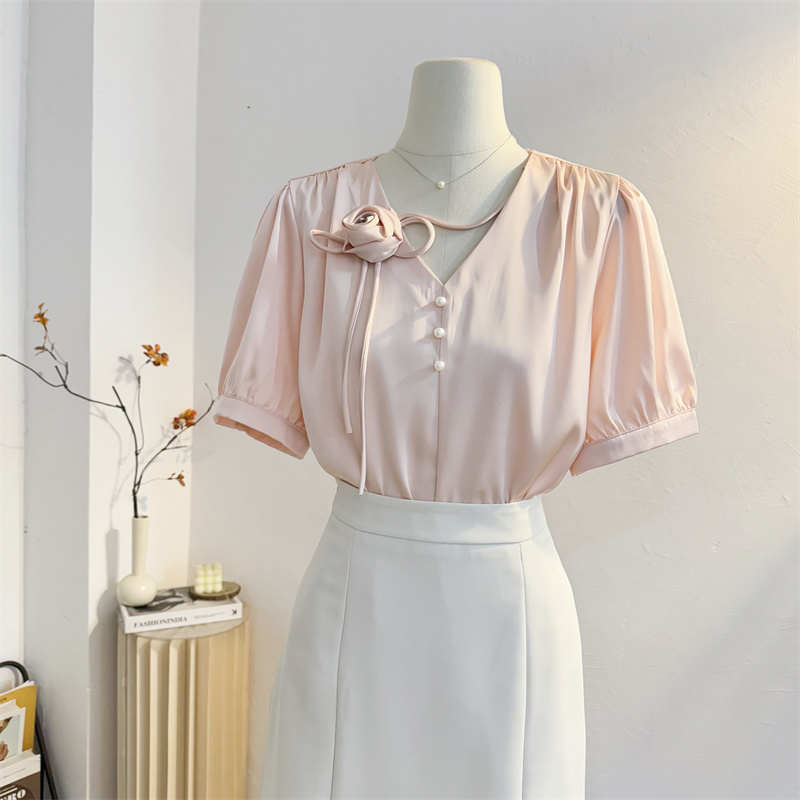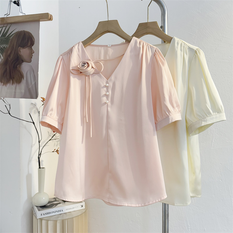 设计感气质醋酸小衫 立体花朵法式 女2025夏季 衬衫 上衣 V领缎面短袖