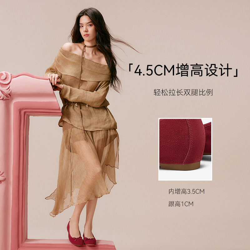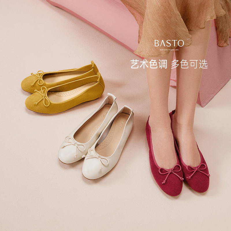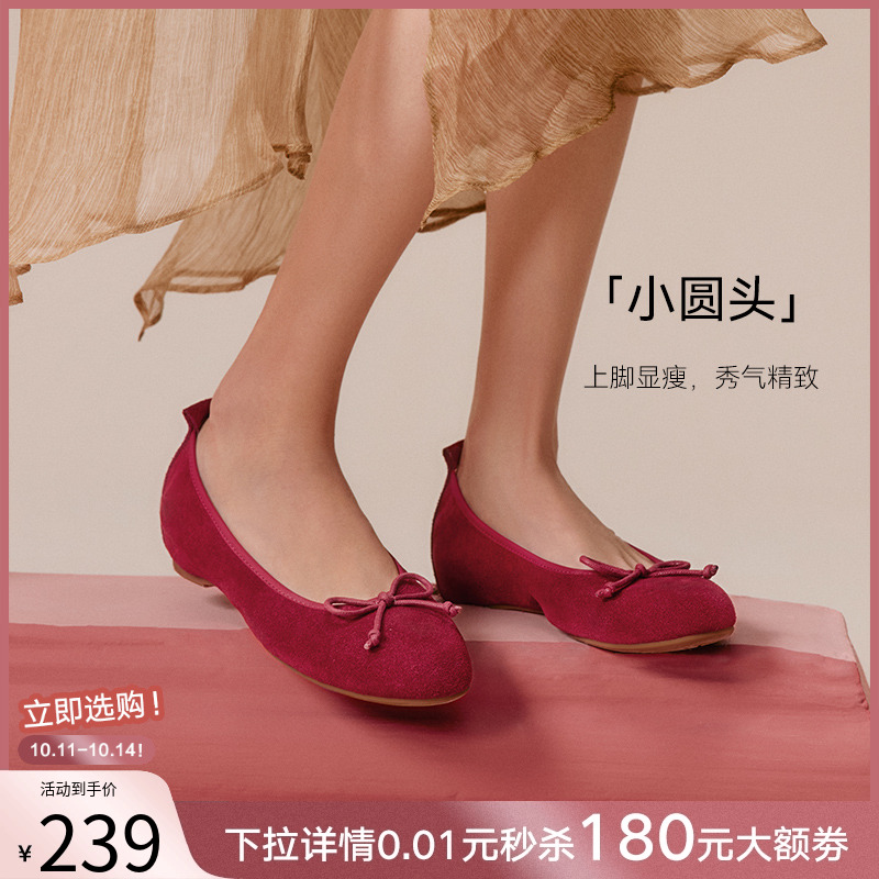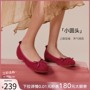 CL993CQ5 蝴蝶结浅口女芭蕾单鞋 百思图25秋新款 真皮红色一脚蹬船鞋