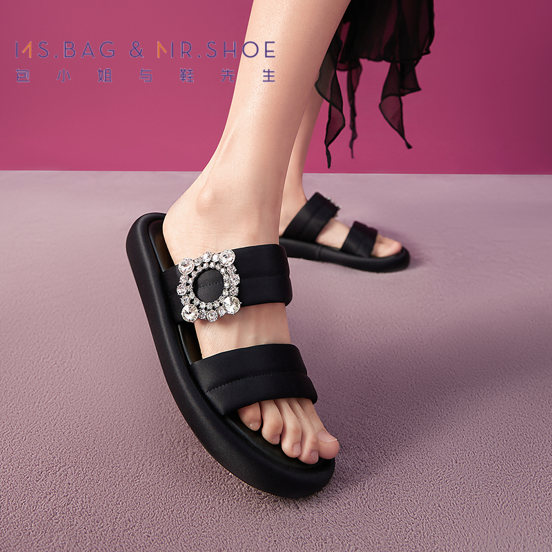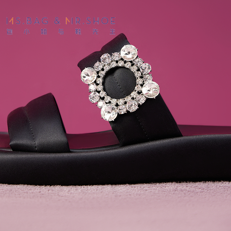 其他拖鞋 黑色水钻一字带凉鞋 方头绝美不累脚拖高跟鞋 新款 2025夏季