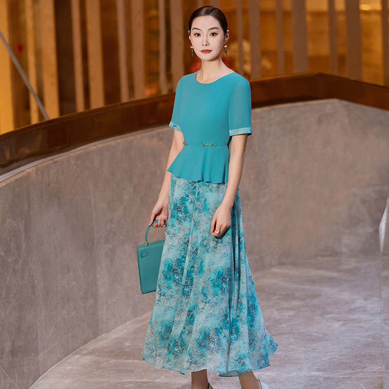 首尚格释2025年夏季 优雅气质圆领假两件收腰大摆印花连衣裙女 新款