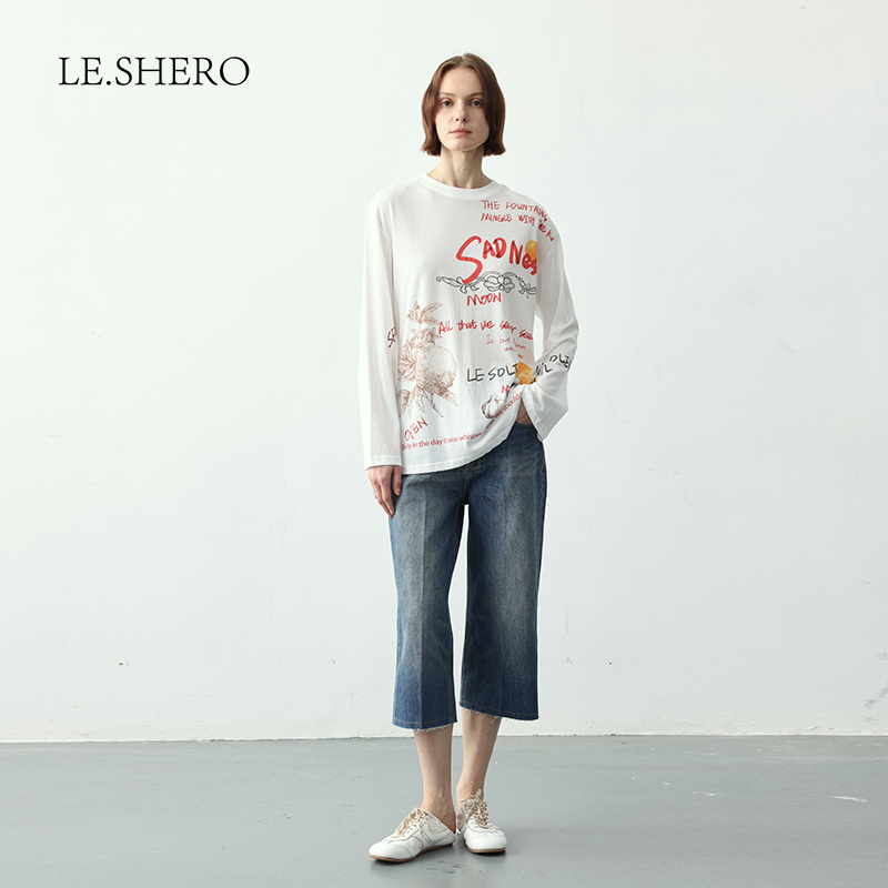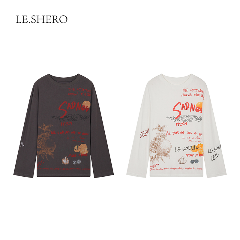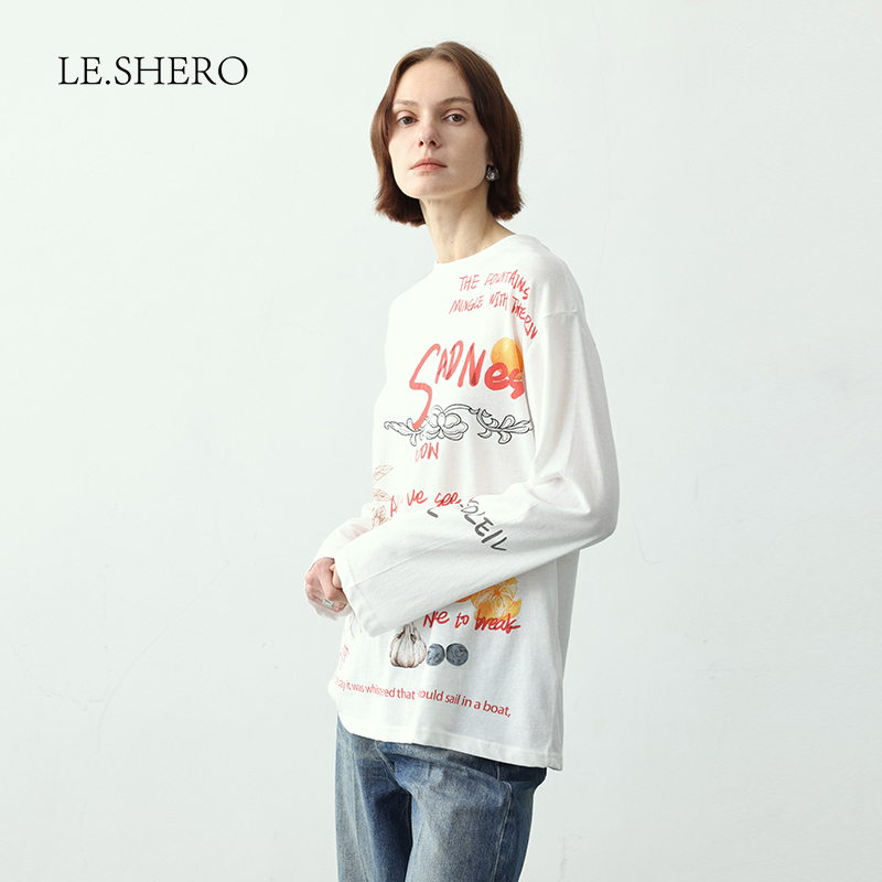 百搭超火减龄上衣 T恤女夏2025新款 LE.SHERO休闲印花落肩薄款 长袖