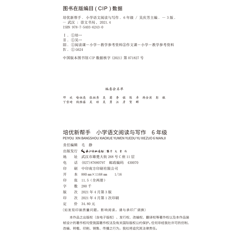 原湖北辞书出版 小学语文阅读与写作 吴庆芳 9787540362430 全2册 培优新帮手 6年级 社 正版 崇文书局 包邮