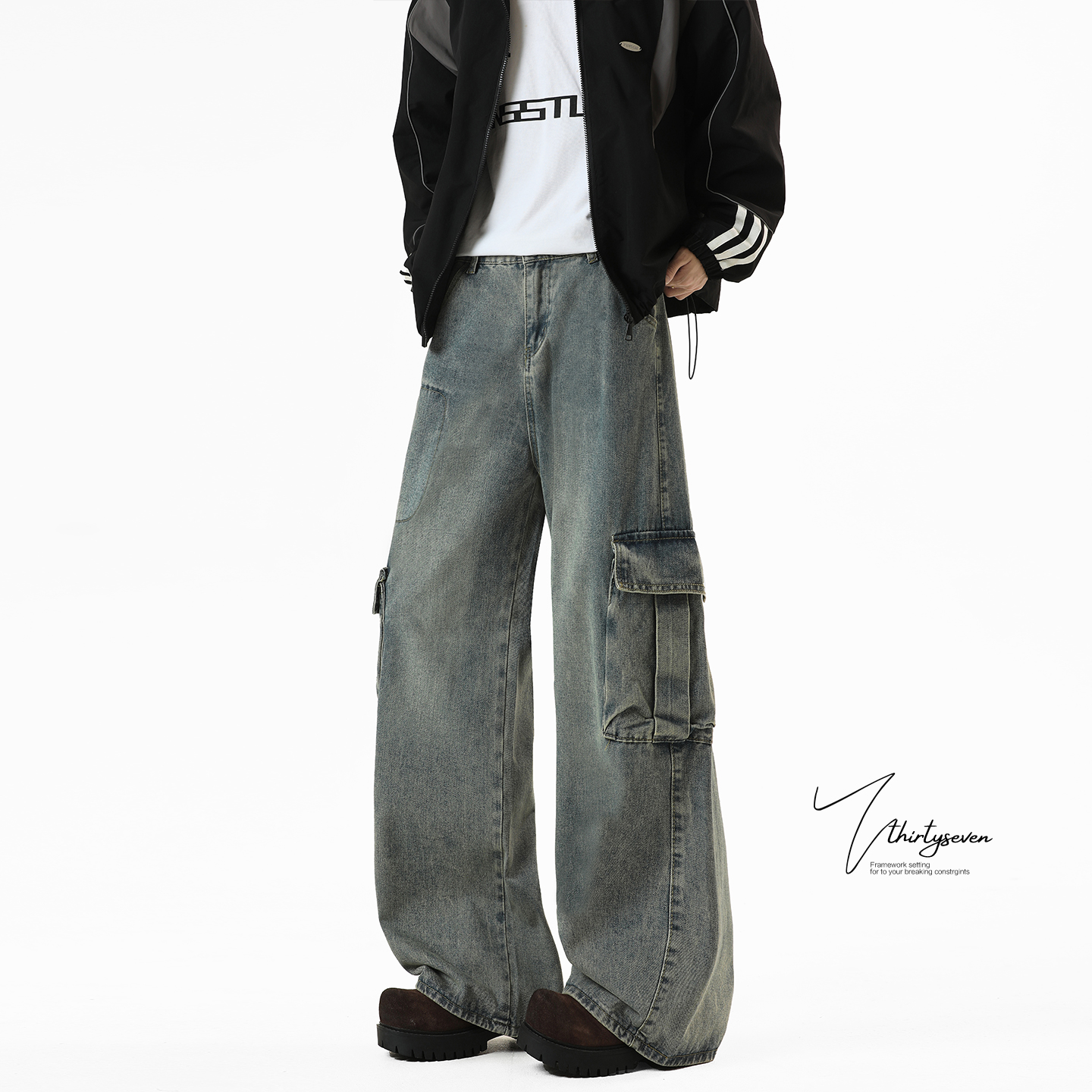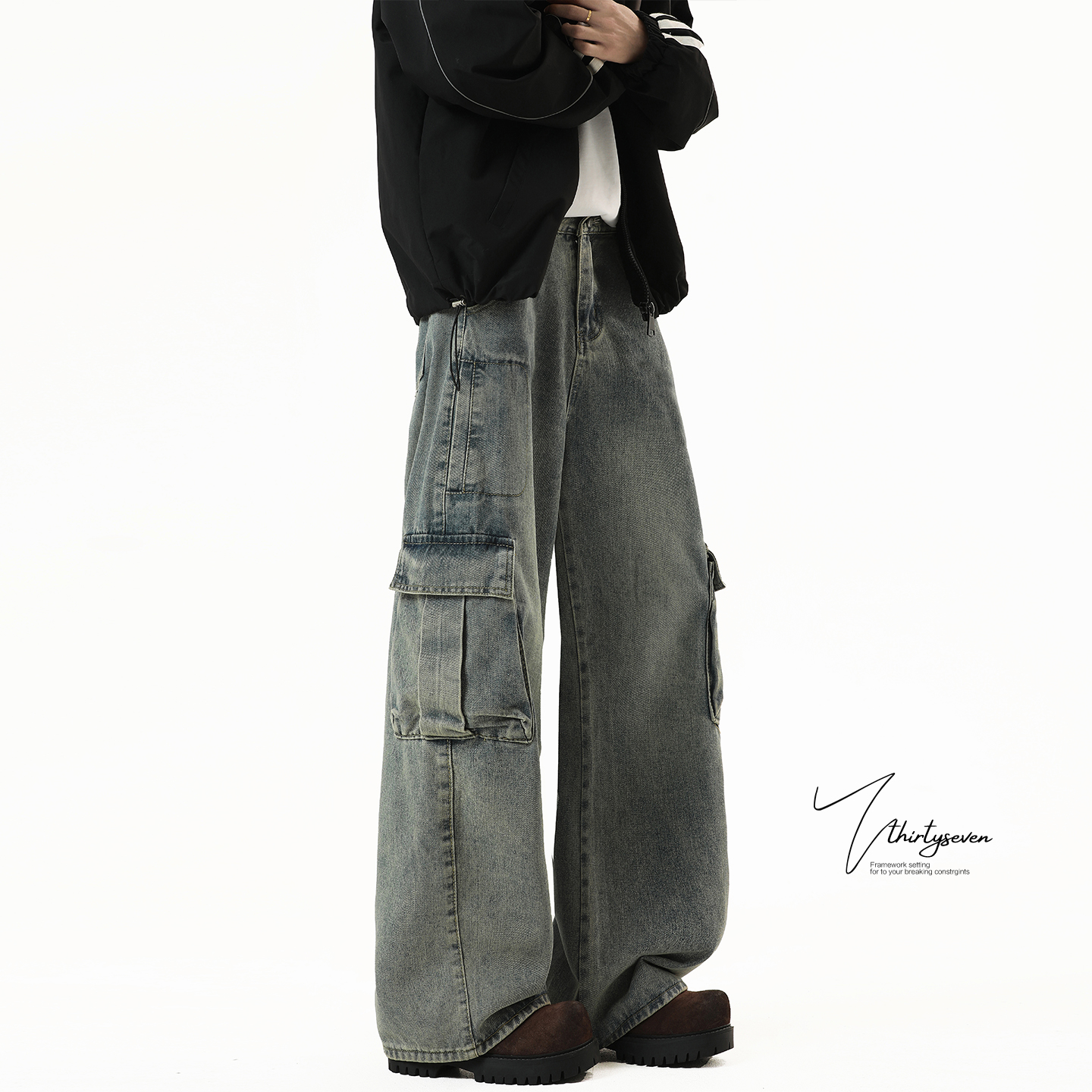 宽松阔腿拖地裤 美式 男秋潮牌水洗做旧直筒长裤 牛仔裤 子 复古蓝工装