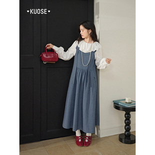 法式 小香风千金格子蓝色打底a字裙 娃娃领假两件绝美连衣裙女秋季