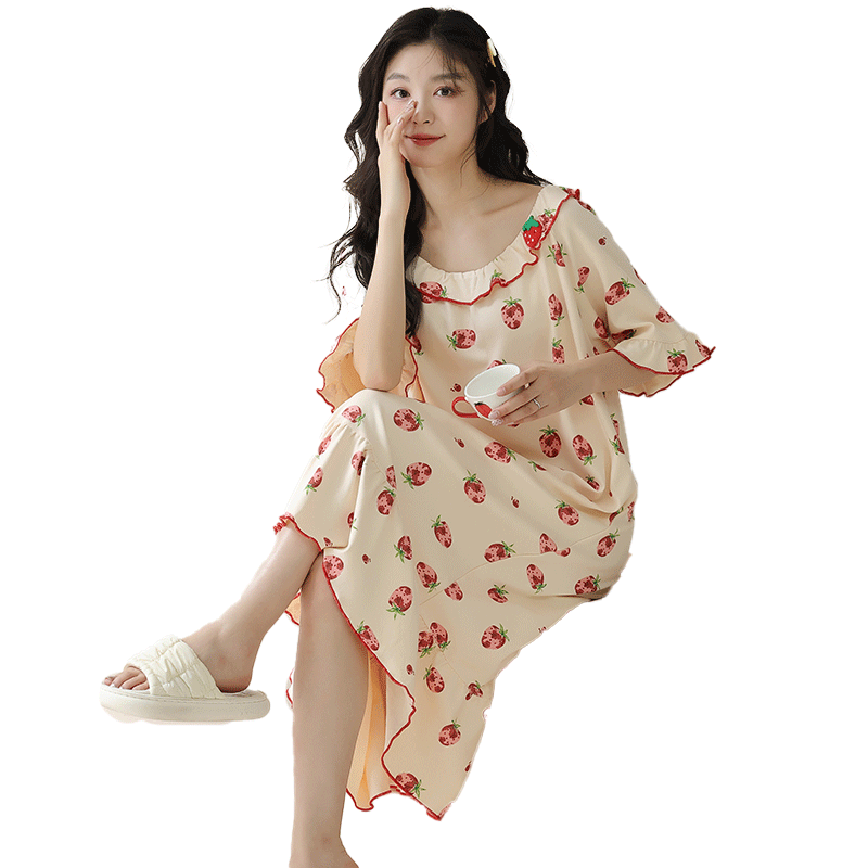 睡衣夏季 韩版 加大码 棉绸睡裙女士短袖 人造棉宽松舒适居家服 加长款