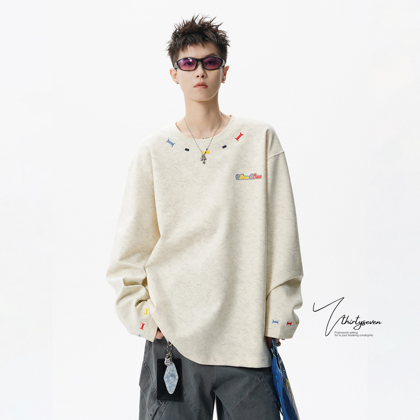 潮牌百搭情侣上衣重磅休闲高级感体恤 t恤男秋季 美式 高街刺绣长袖
