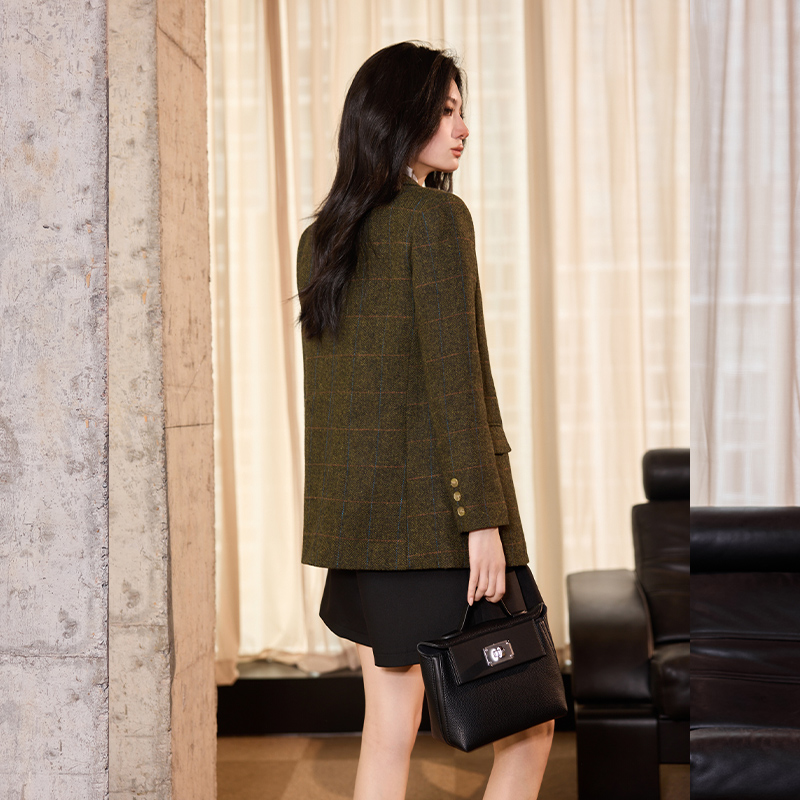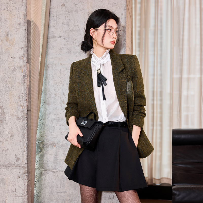 女式 西服翻领双排扣垫肩长袖 外套 冬新款 白鹿语英伦风老钱风西装
