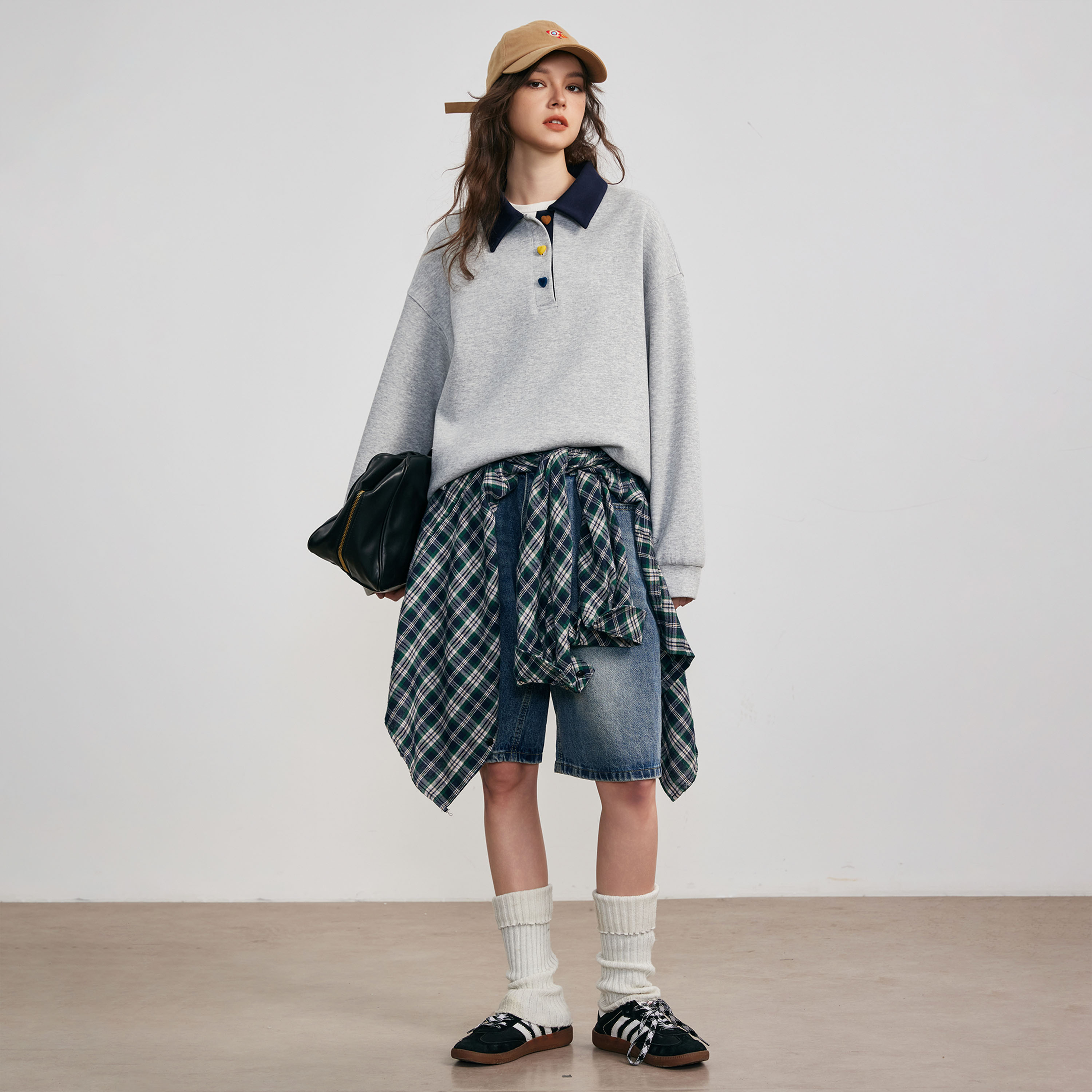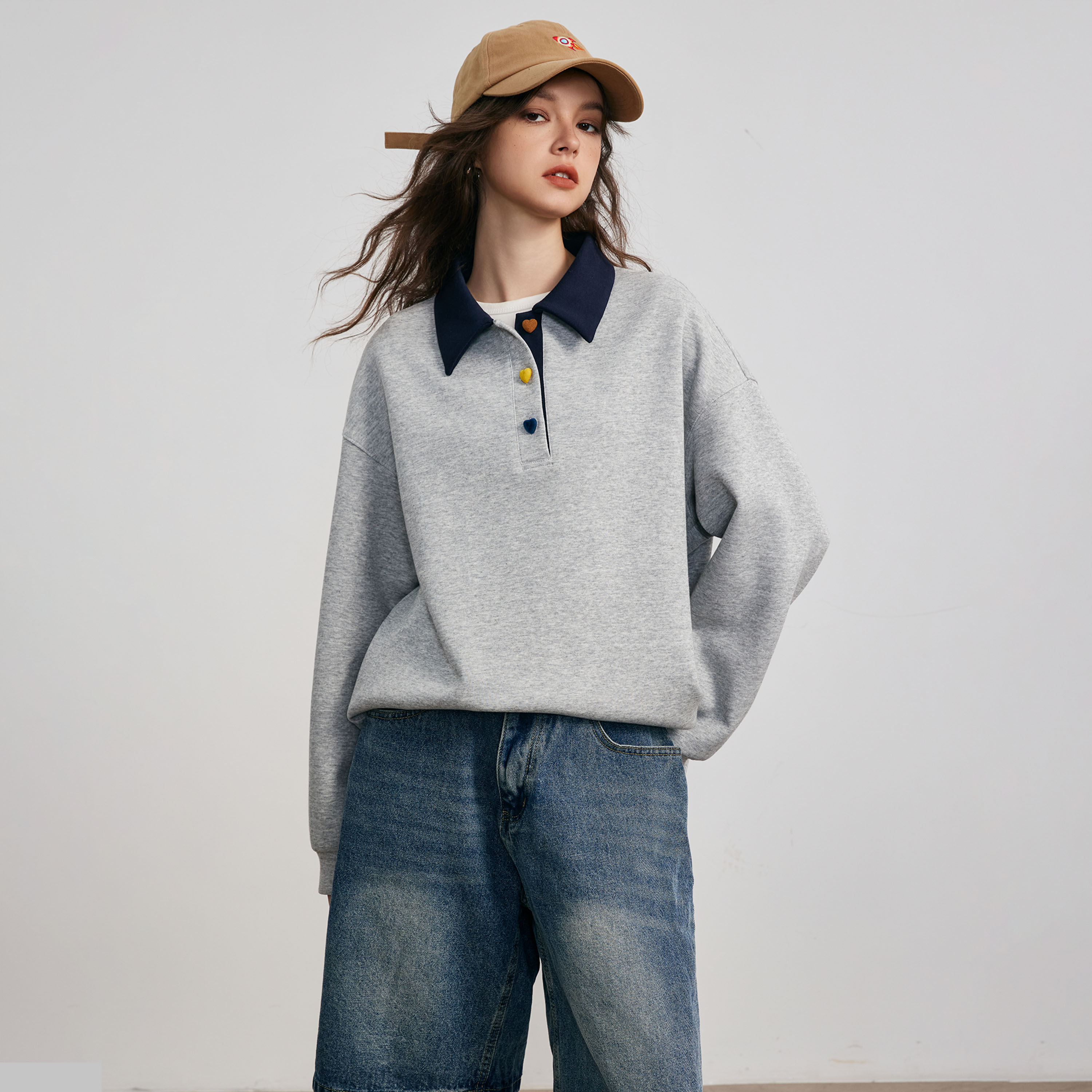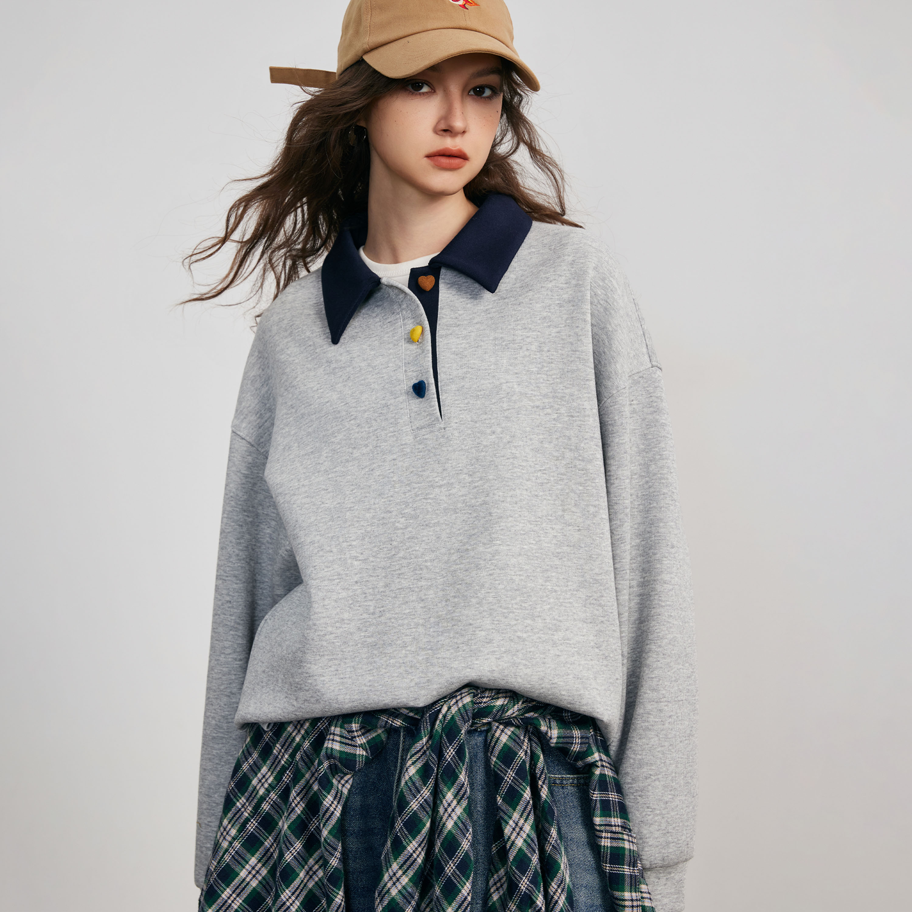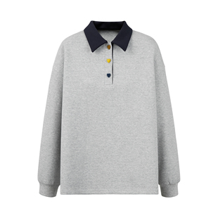 减龄显瘦上衣 百家好学院风灰色POLO领卫衣女2025秋季 Basic House