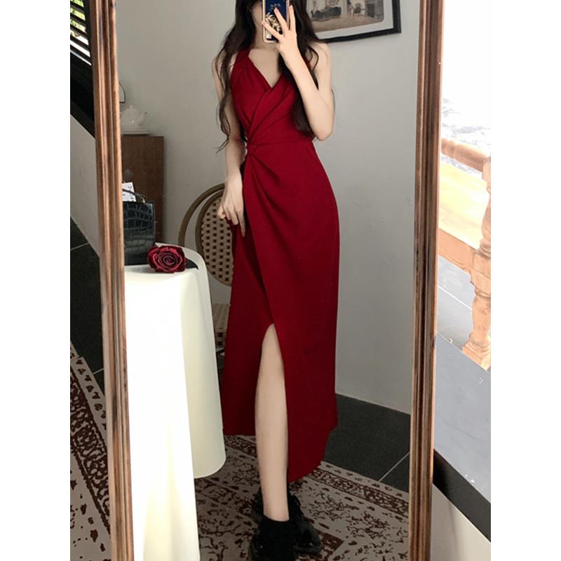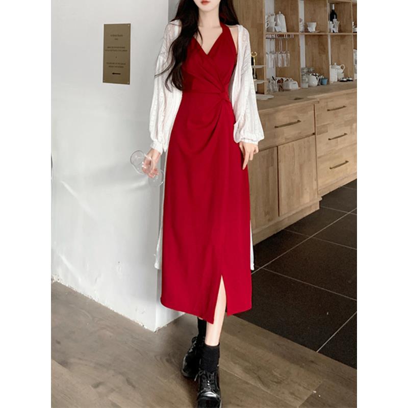 气质高级感中长款 镂空红色连衣裙女春夏新款 裙子 蕾丝时尚 朗姿法式