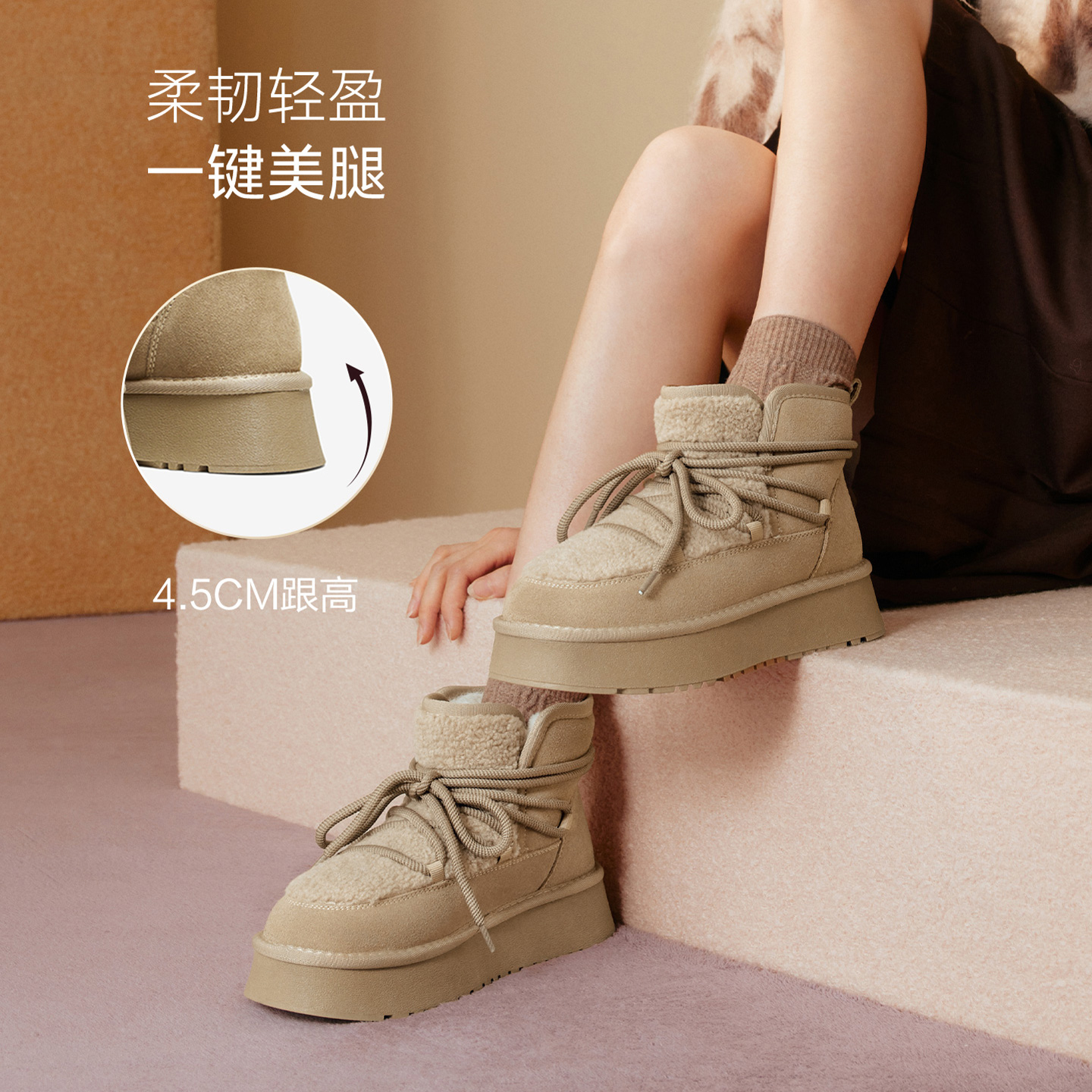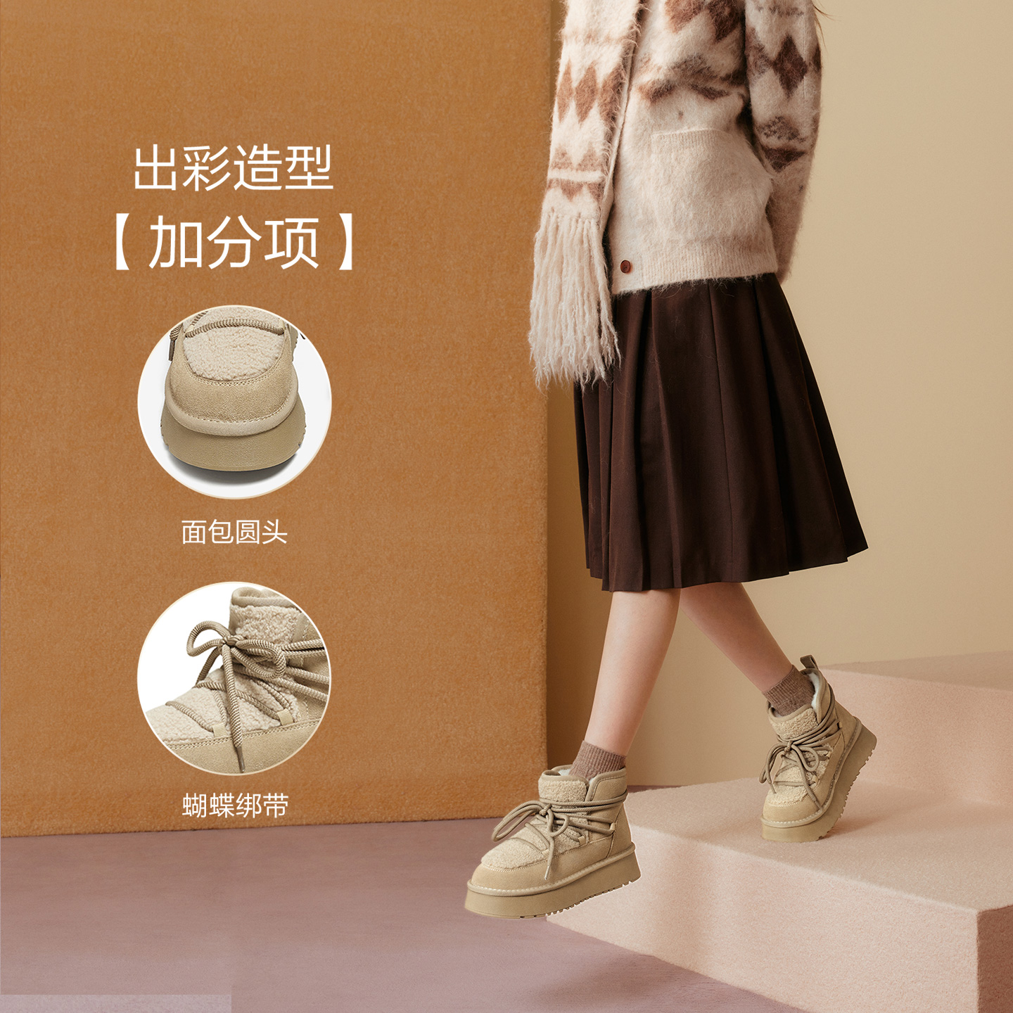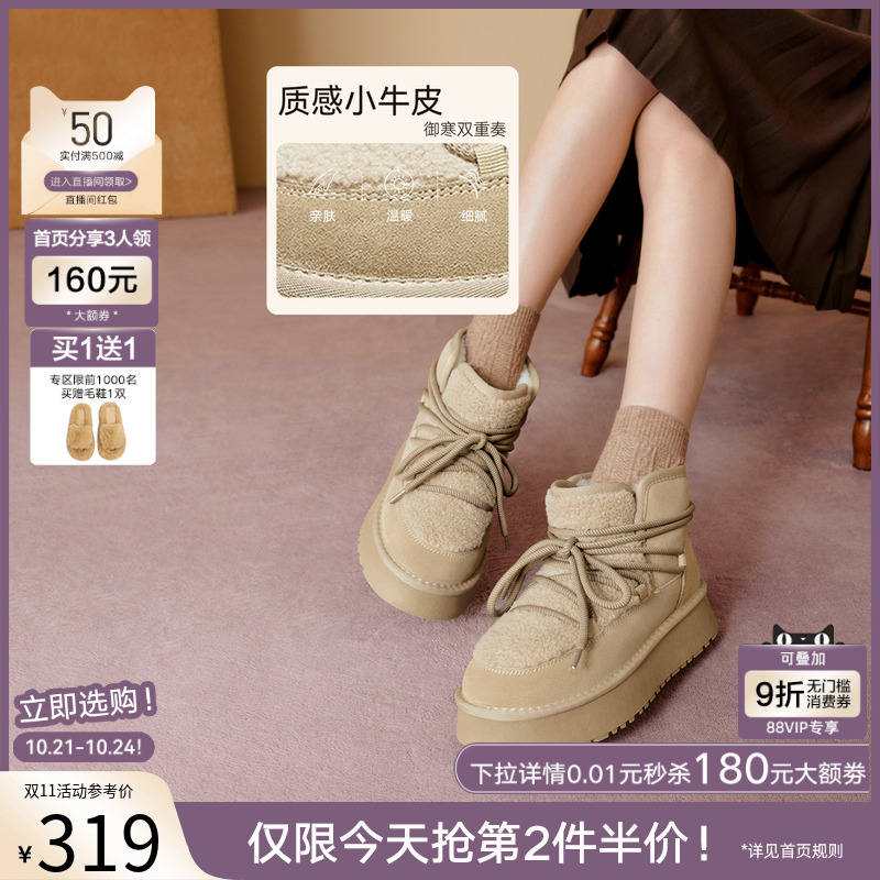 厚底雪地靴保暖棉鞋 新款 百思图2025冬季 女短靴L8728DD5 面包靴