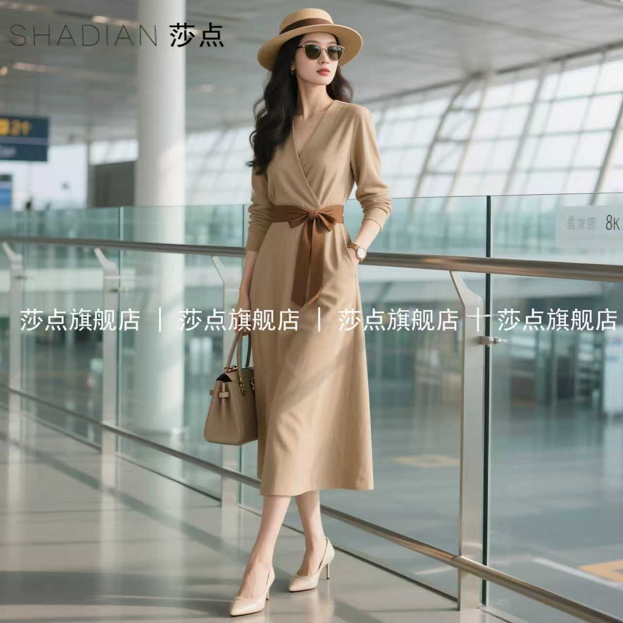 V领卡其色连衣裙女春秋长袖 气质收腰长裙高级感配腰带 2025新款