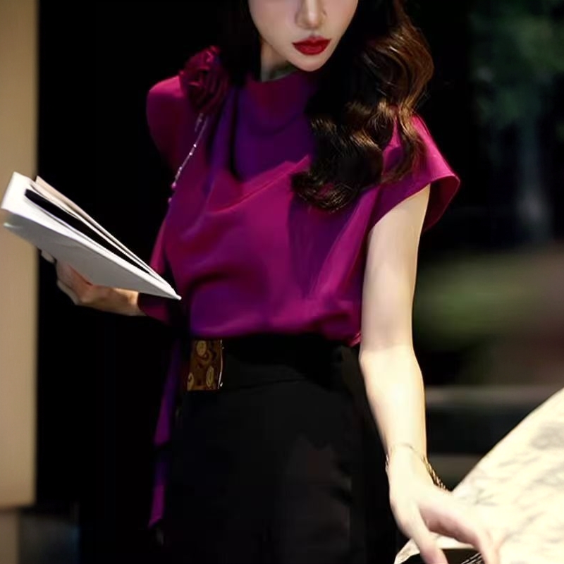 通勤高级缎面上衣 减龄时尚 法式 赫本风气质立体花朵红色衬衣女夏季