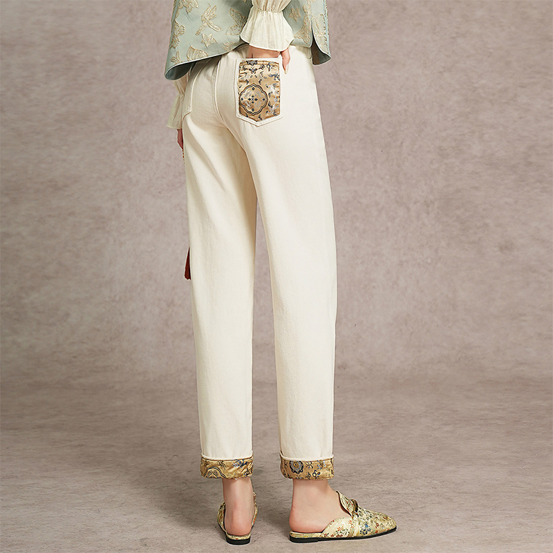 气质全棉休闲牛仔裤 时尚 女 25秋款 白鹿语撞色拼接提花面料九分裤