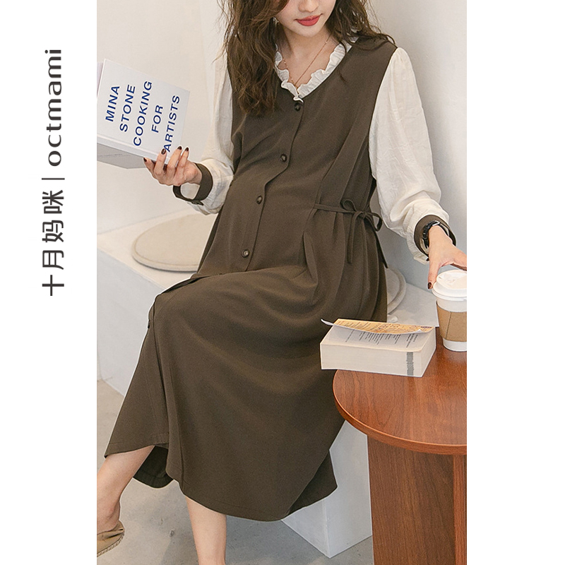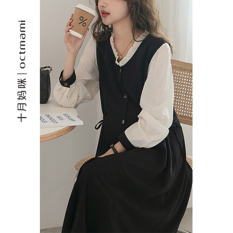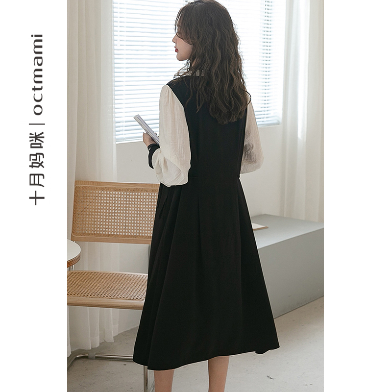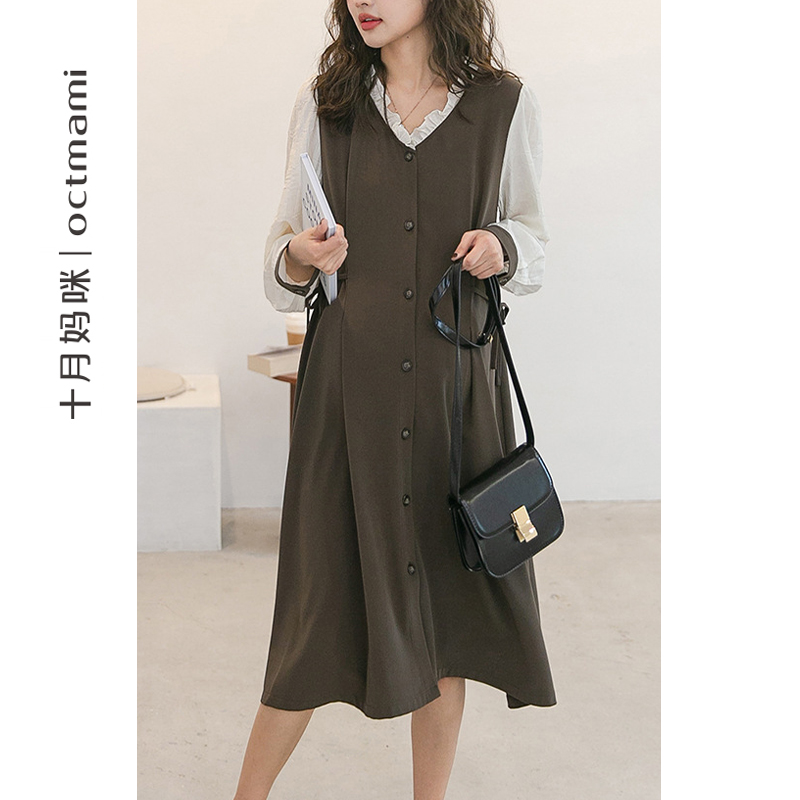 过膝裙子秋装 十月妈咪孕妇连衣裙春秋季 外穿小V领雪纺拼接中长款