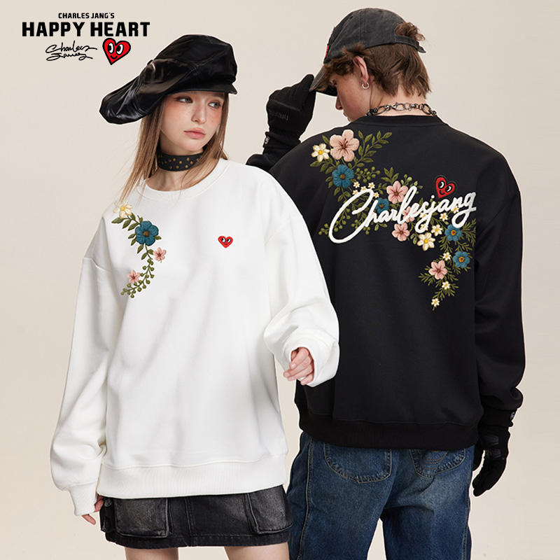 圆领卫衣男女春秋冬季 落肩袖 百搭 仿刺绣花朵印花美式 查尔斯桃心