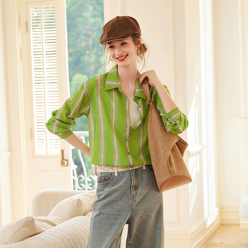 上衣 高级感慵懒风休闲长袖 白鹿语港风复古撞色条纹衬衫 25秋新款