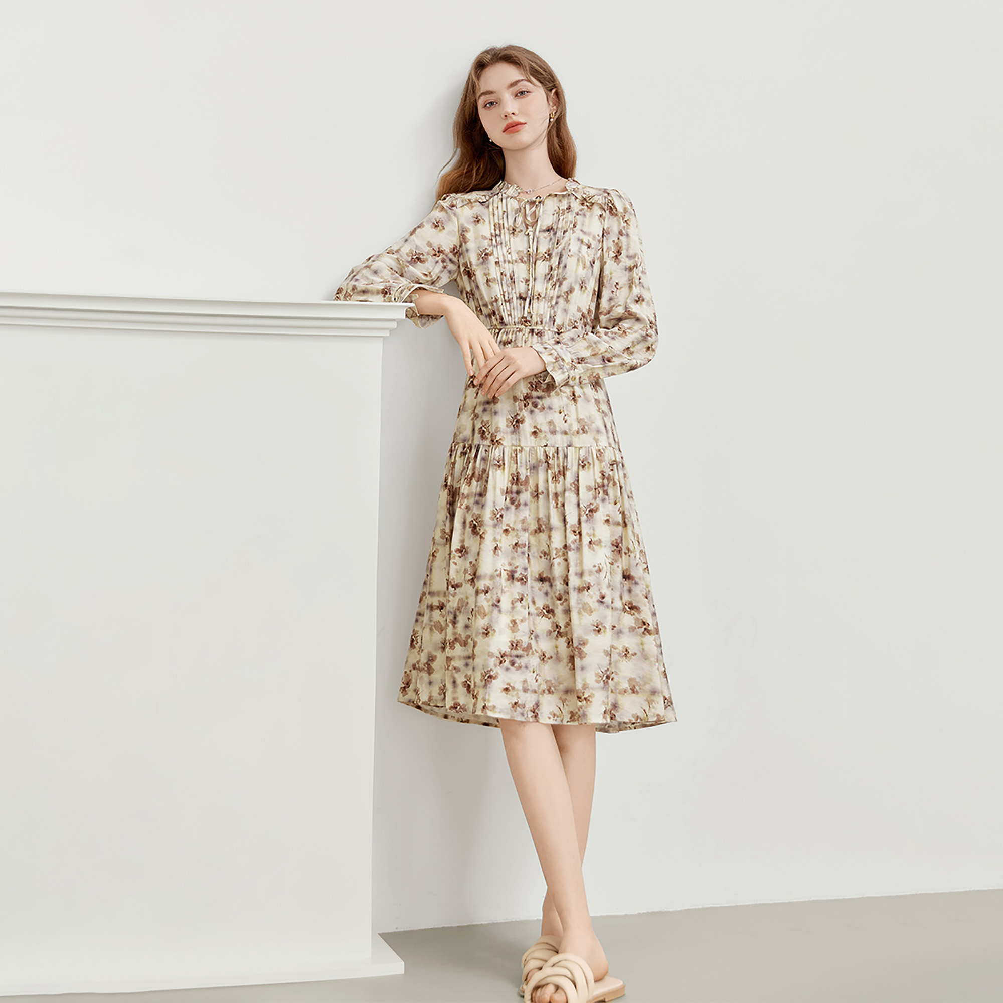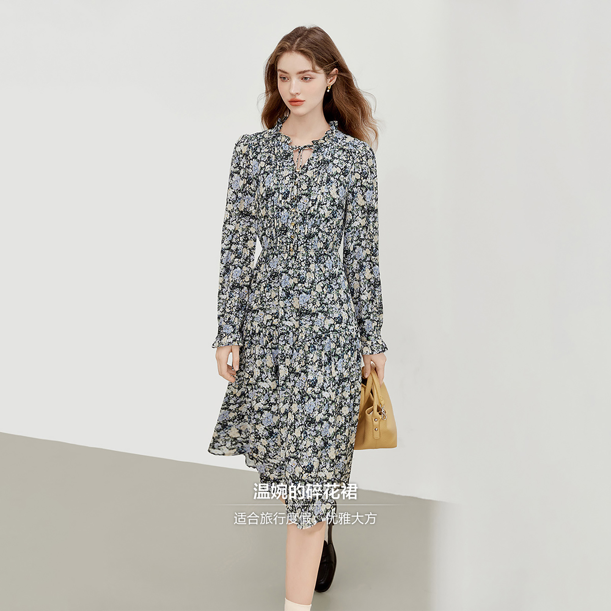 Vero 含棉捏褶老钱风中长裙32537D011 Moda连衣裙女2025秋冬新款