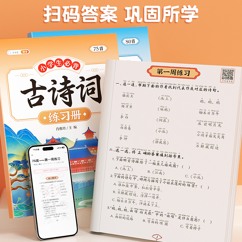 80首练习册小学通用注音人教版 小学生必背古诗词75 文言文古诗文大全一本通一二三年级四五六年级同步语文课本诗词巩固 斗半匠