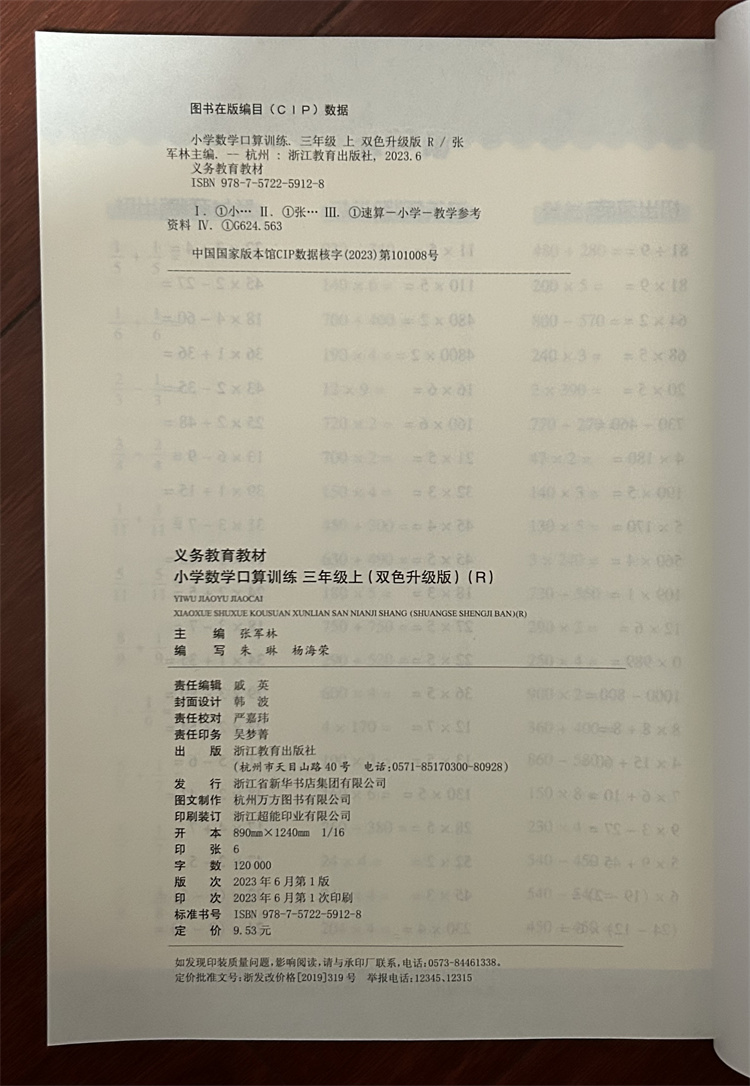 学校课本配套浙江教育出版 2023秋义务教育教材小学数学口算训练三年级上部编人教版 社口算题卡3年级上计算能手一天一练 学校同款