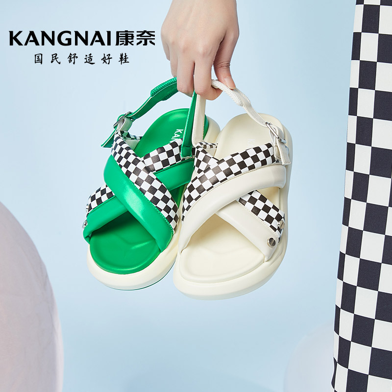 女士平底休闲鞋 外穿时尚 子女款 新款 百搭格子凉拖 夏季 康奈运动凉鞋