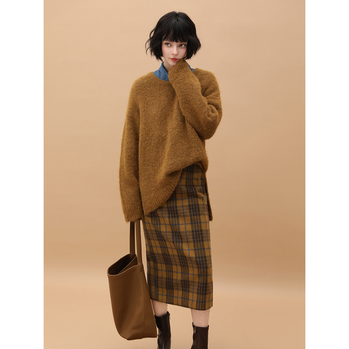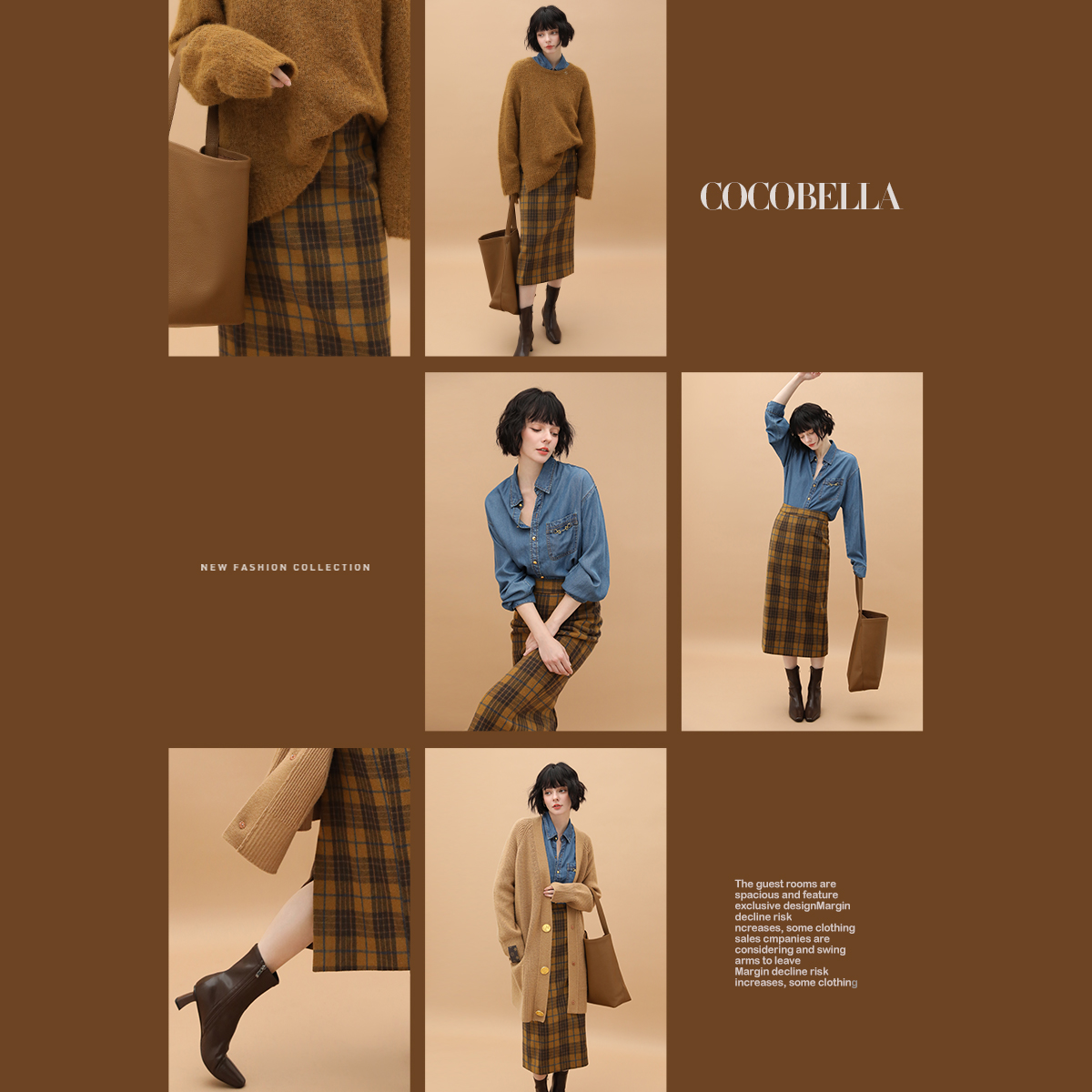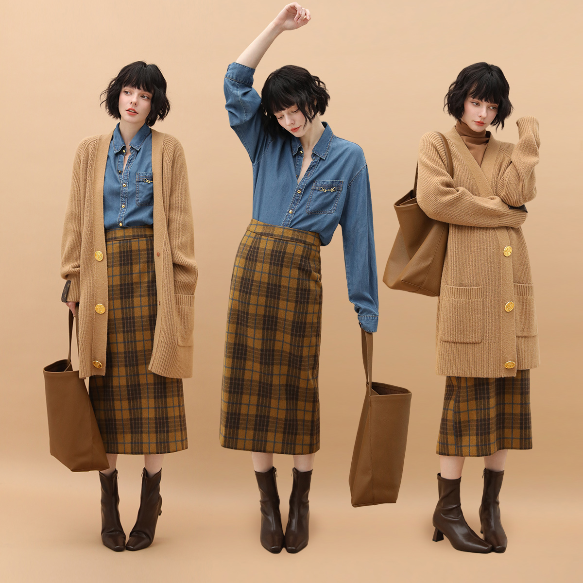 COCOBELLA 复古格纹毛呢半身裙女秋冬加厚直筒裙HS923 美拉德穿搭