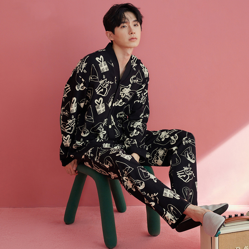 时尚 纯棉长袖 休闲可外穿家居服秋冬季 黑色开衫 男士 套装 睡衣春秋款