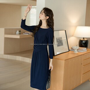 设计感针织连衣裙新款 水晶麻柔垂感松弛老钱风蓝色白领直筒裙2186