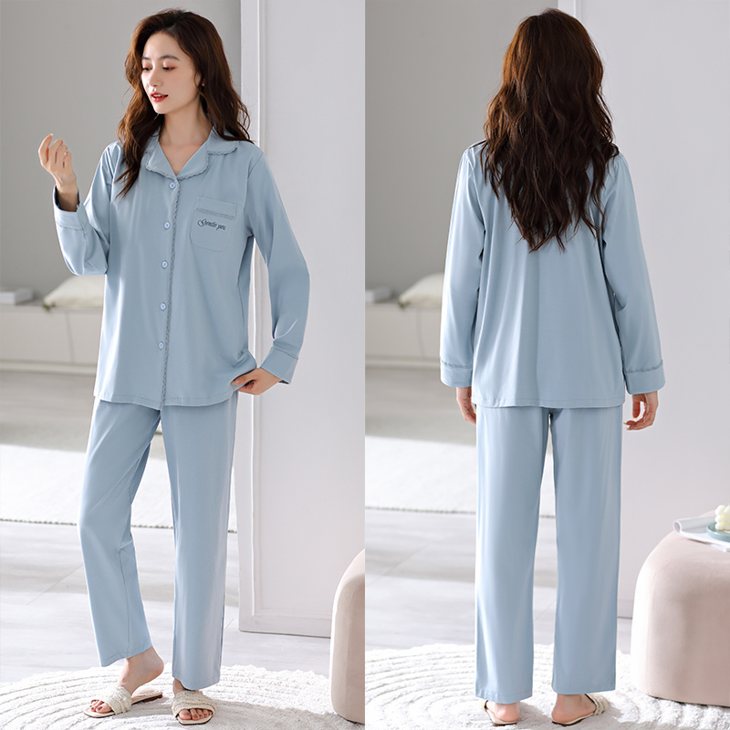 套装 翻领高级可外穿家居服大码 长袖 猫人纯棉睡衣女带胸垫秋冬新款