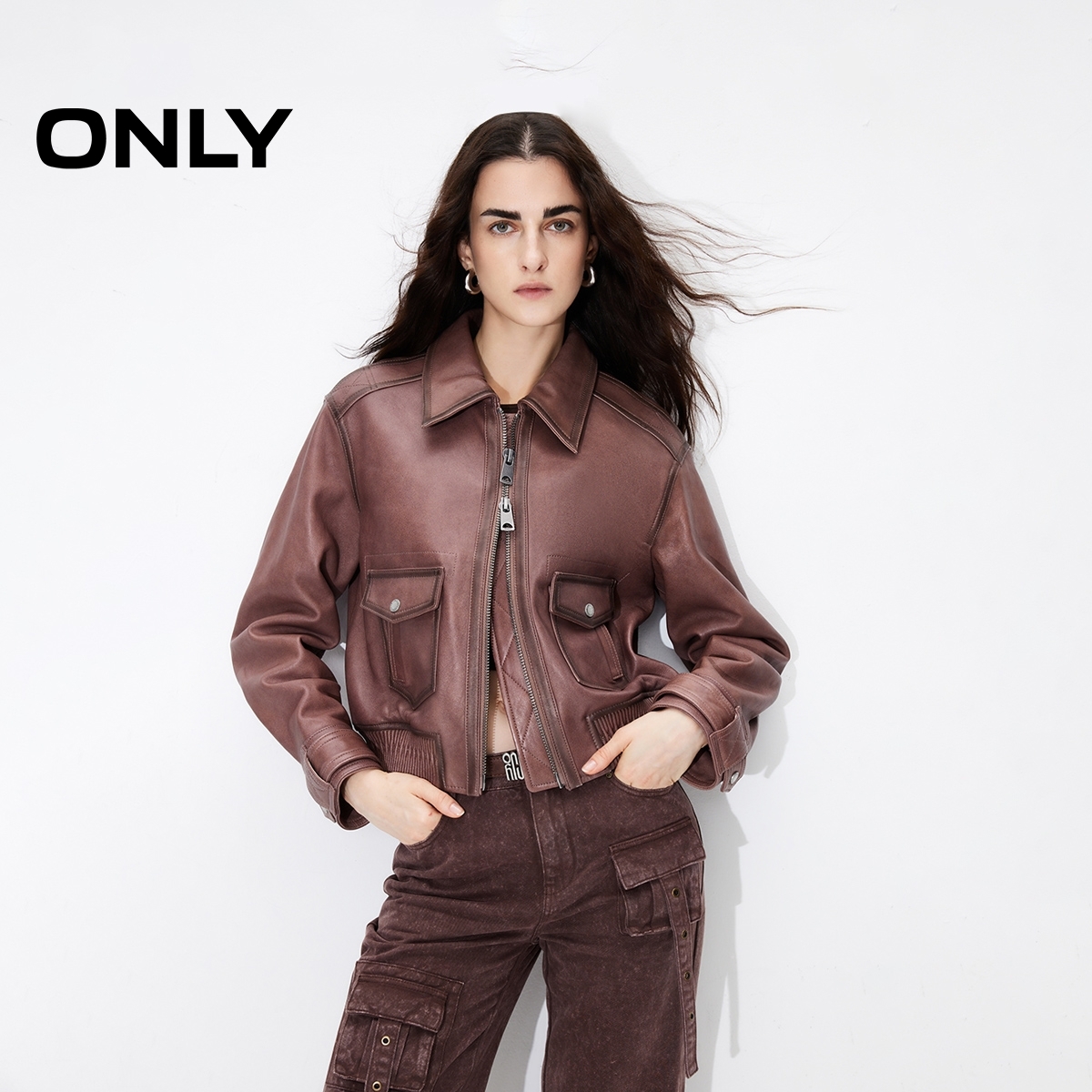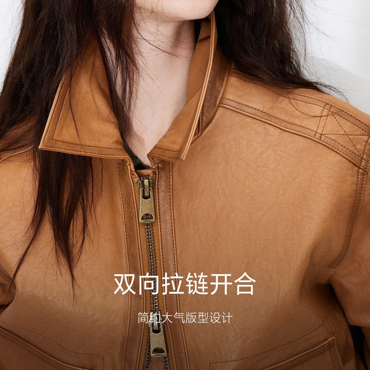 潮酷风做旧翻领口袋短款 秋季 皮衣外套女 ONLY奥莱