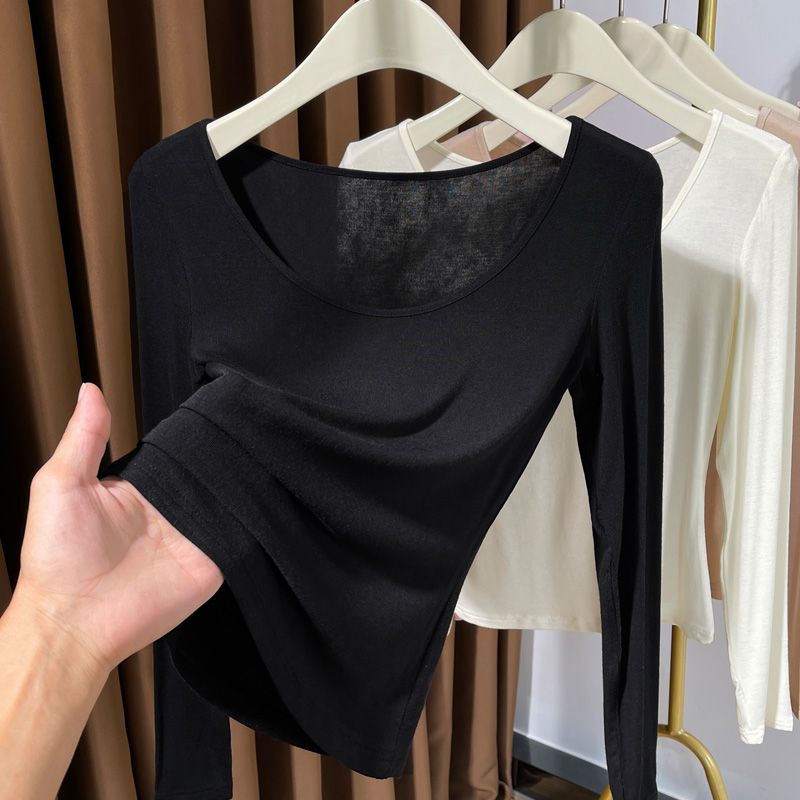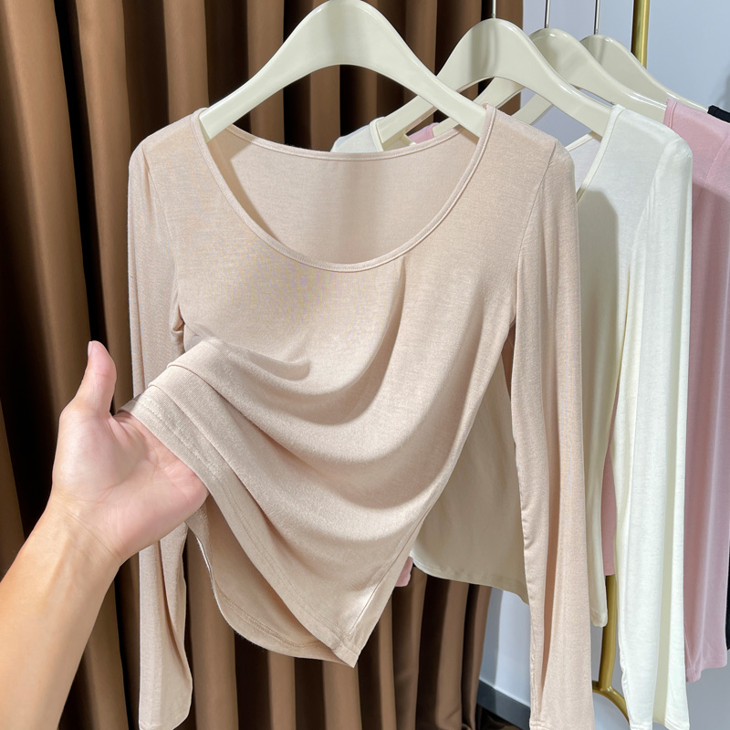 超弹皮肤衣女莫代尔t恤长袖 粉色大圆领内搭打底衫 女春秋2025新款