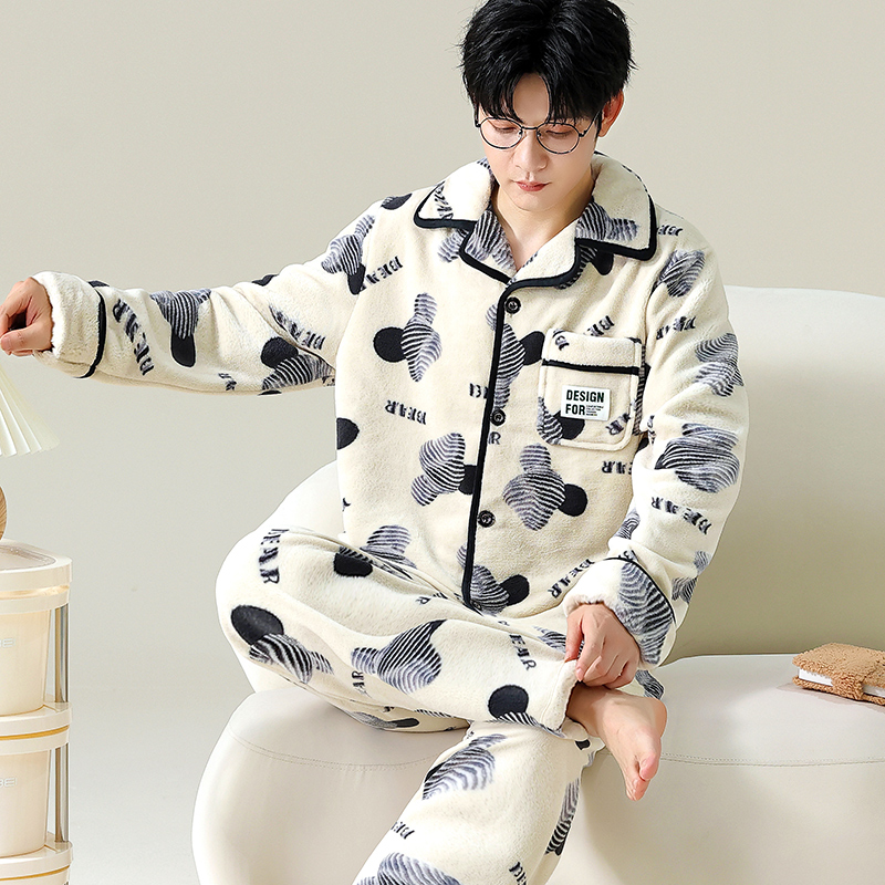 春秋大码 可外穿家居服保暖长袖 法兰绒 加厚珊瑚绒套装 睡衣男秋冬季
