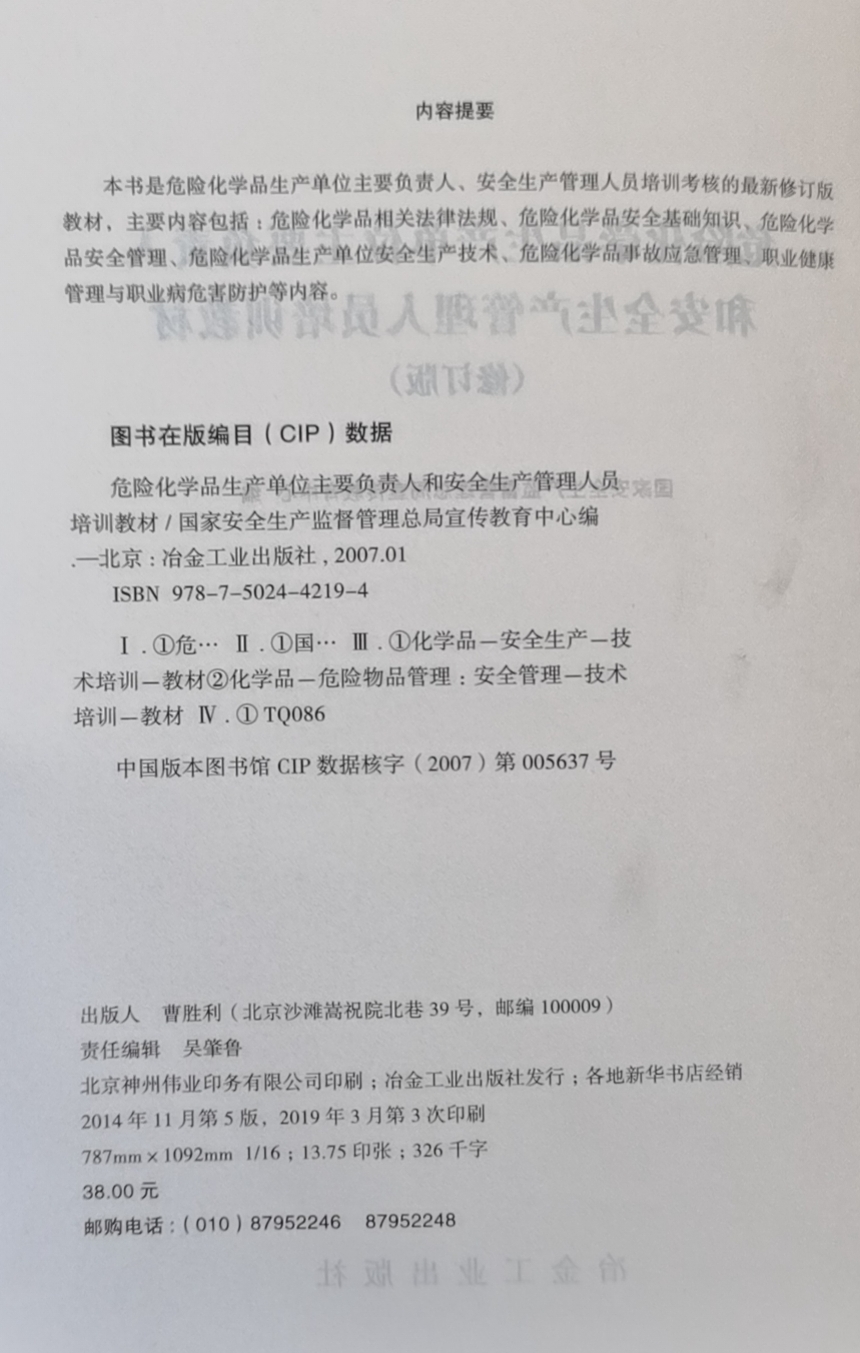 危险化学品生产单位主要负责人和安全生产管理人员培训教材 化工企业用书 2019年3月版