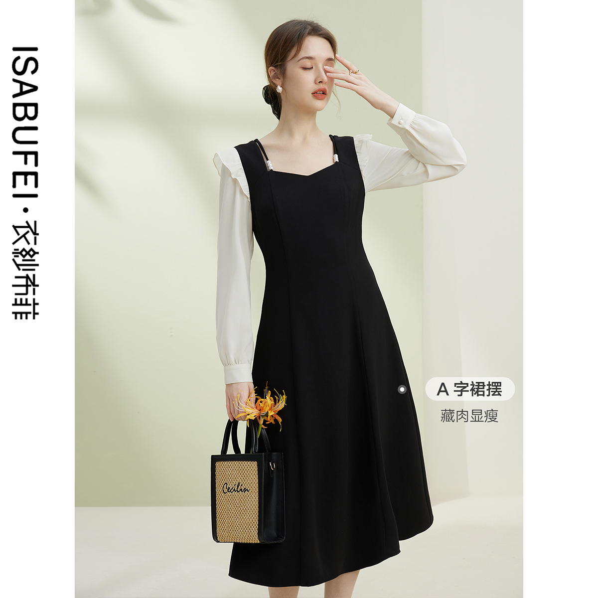 新款 连衣裙女秋季 高级感学院风a字花苞裙 撞色假两件衬衫 气质法式
