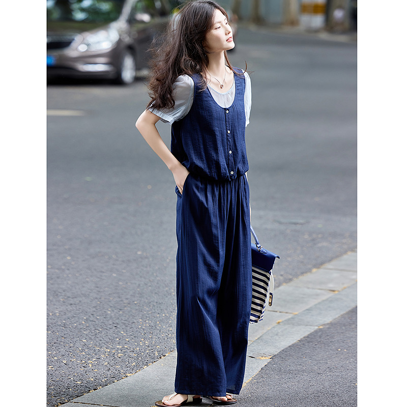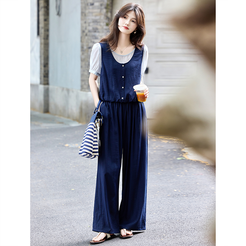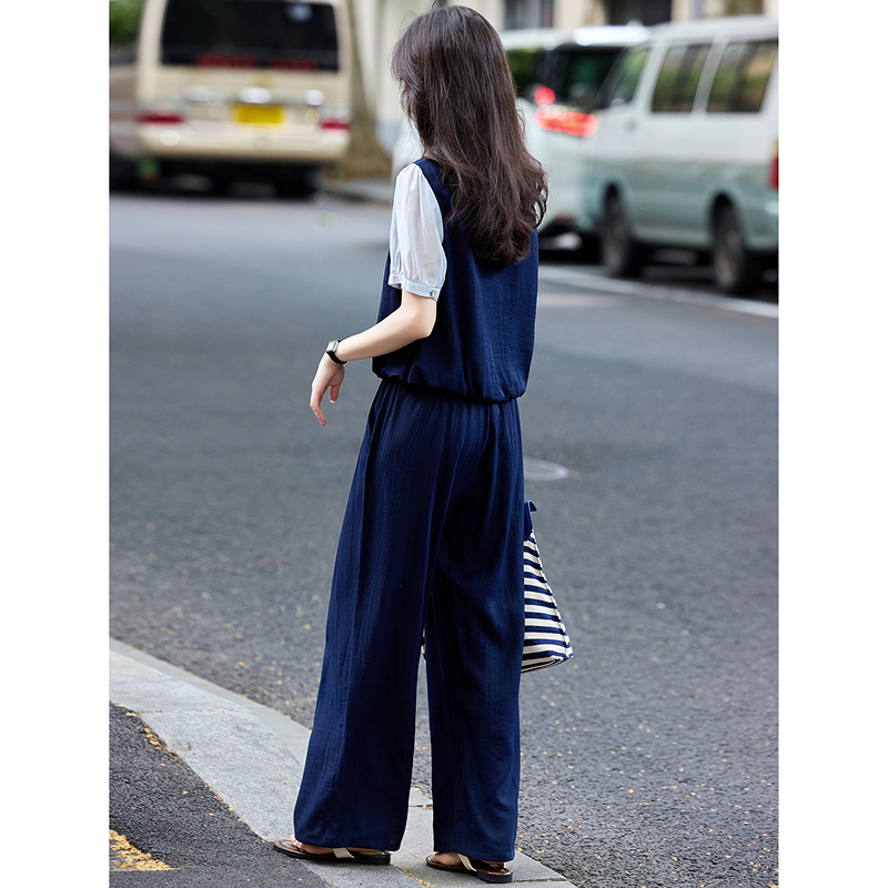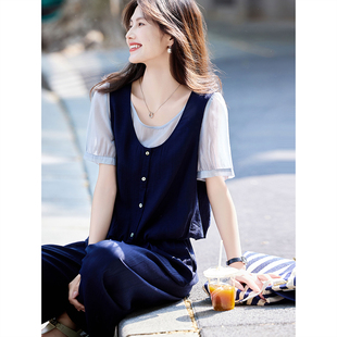 女休闲拼接简约通勤职场风长裤 时尚 新款 2025年夏季 两件套 气质套装