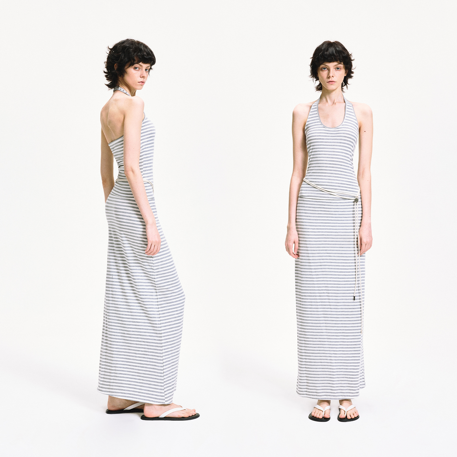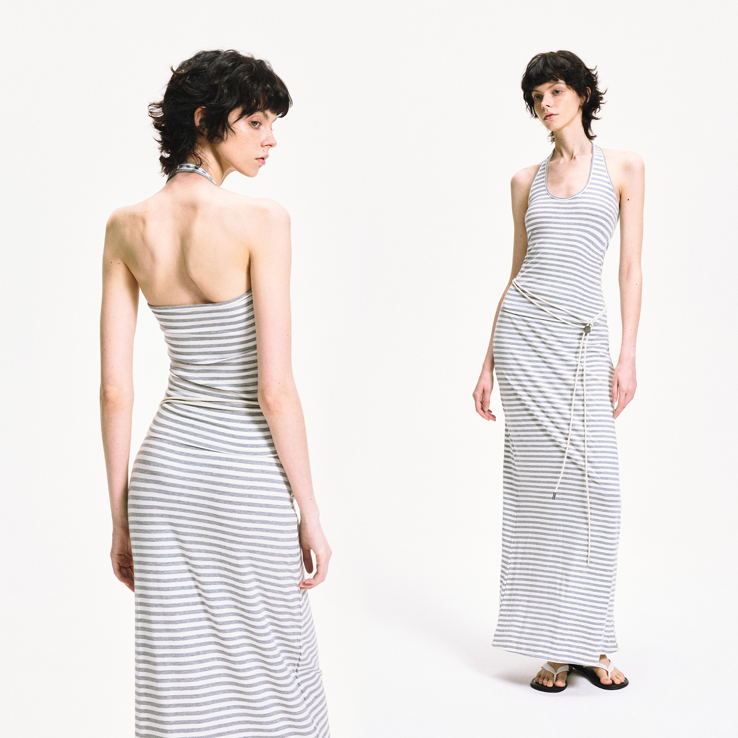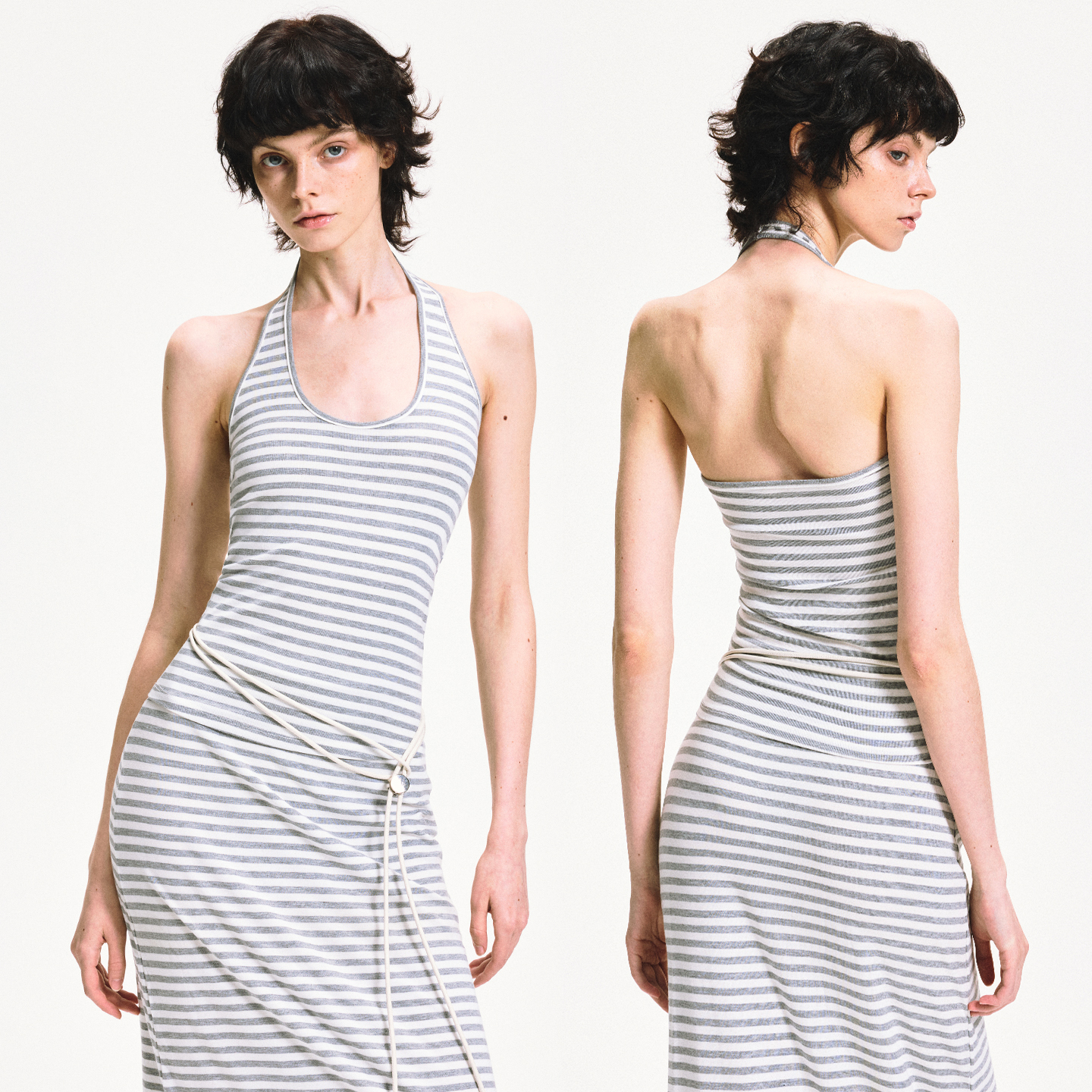 收腰夏季 挂脖背心 休闲露背吊带上衣 莱赛尔条纹U领弹力修身 KVKV
