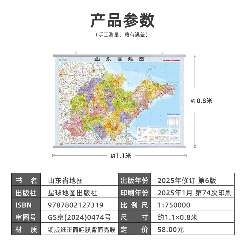 约1.1×0.8m 超大无拼接正版 高清双面覆膜防水 饰画 山东省地图挂图 商务办公室会议室客厅教室通用挂图装 卷筒发货 2025新版