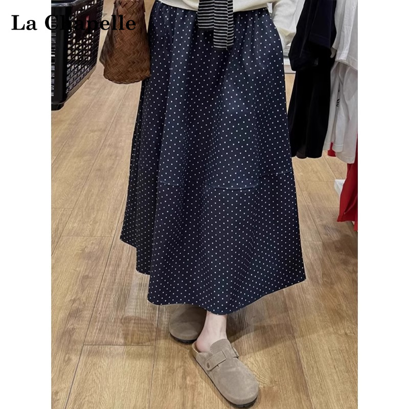 拉夏贝尔藏蓝色波点半身裙女早秋新款 a字裙子 梨型身材遮胯中长款