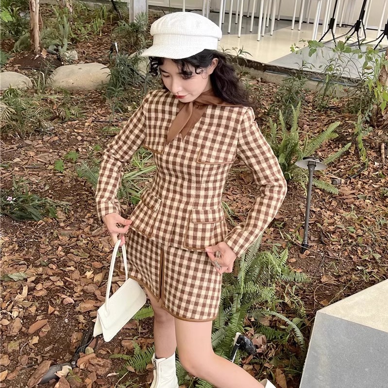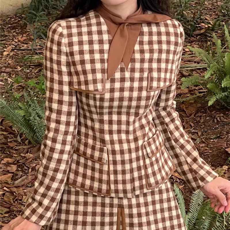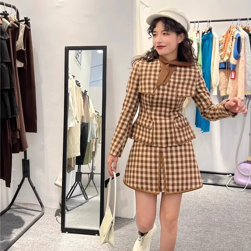 饰秋冬 品牌授权Montsand格纹夹克迷你半身裙腰带装 清货折