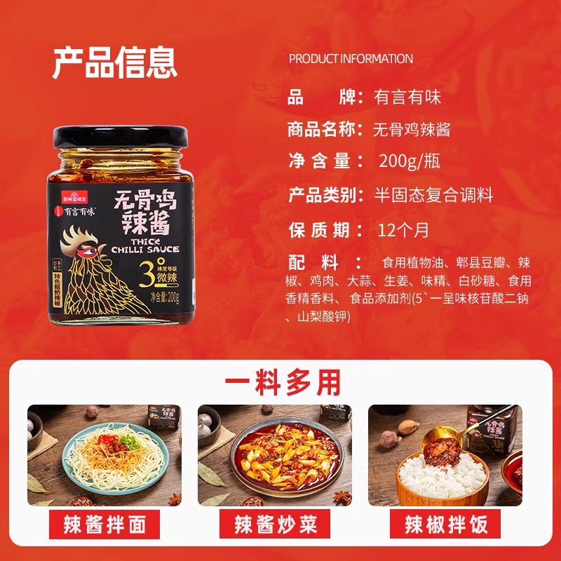 有言有味无骨鸡辣酱200g辣椒酱招牌下饭菜拌饭酱拌面酱微辣家用
