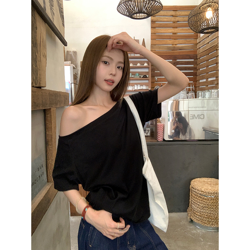 上衣 百搭宽松显瘦小个子设计感斜肩半袖 一字肩黄色t恤女短袖 夏季
